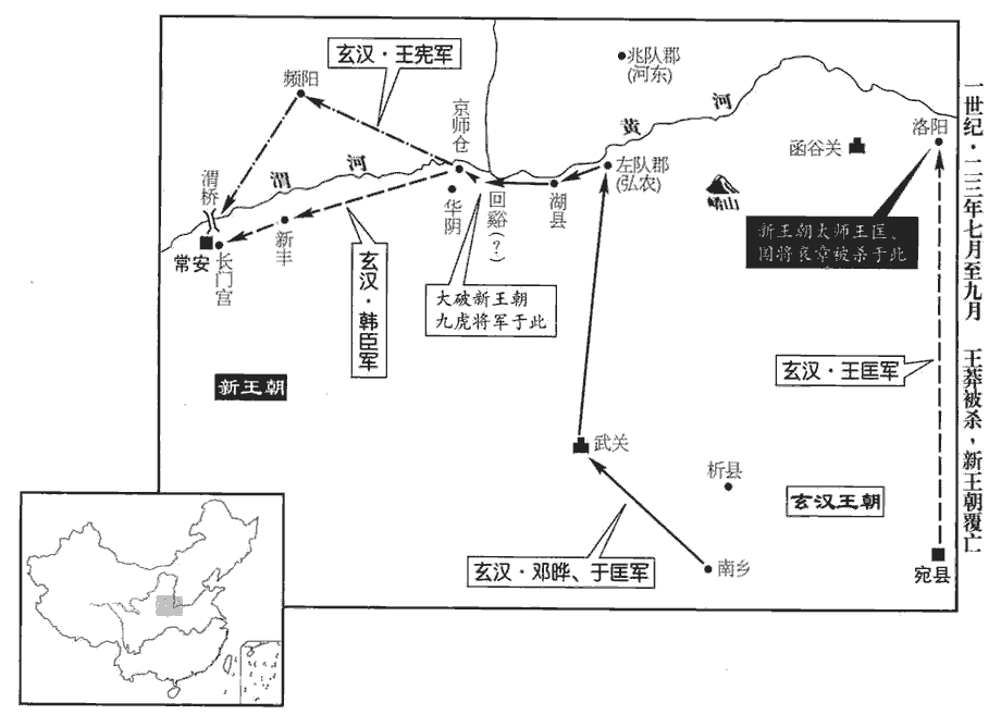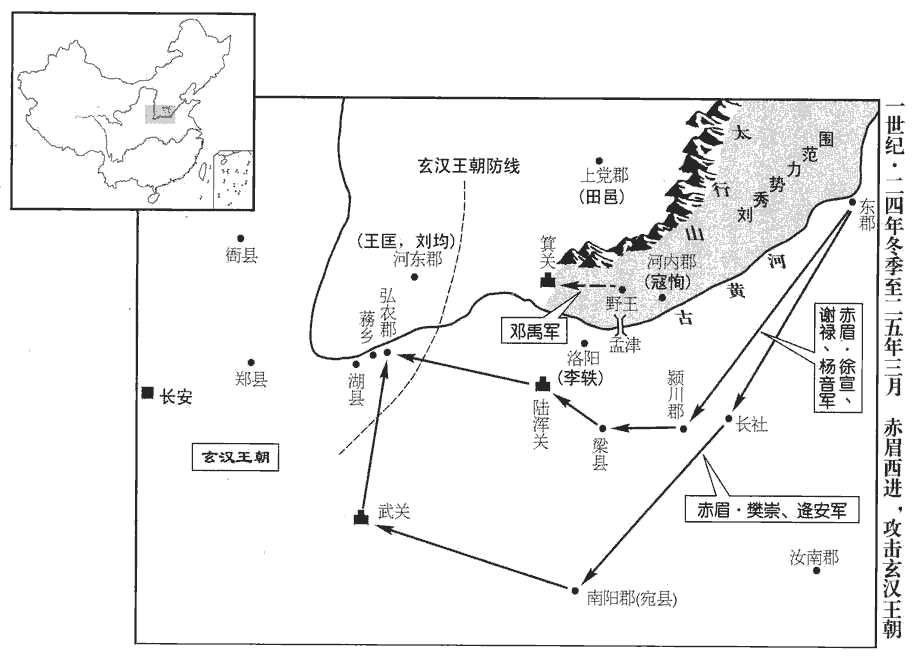 12赤眉樊崇等將兵入潁川‹河南禹州›,分其眾為二部,崇與逄安為一部,東觀記曰:逄,音龐。徐宣、謝祿、楊音為一部。赤眉雖數戰勝,數,所角翻。而疲弊厭兵,皆日夜愁泣,思欲東歸;崇等計議,慮眾東向必散,不如西攻長安。於是崇、安自武關‹陝西商南西南›、宣等從陸渾關‹河南嵩縣東北›賢曰:武關,在今商州上洛縣東。文穎曰:弘農析縣西百七十里有武關。前書曰:陸渾縣有關,在今洛州伊闕縣西南。地理志,陸渾縣屬弘農郡。師古曰:渾,音胡昆翻。兩道俱入。更始使王匡、成丹與抗威將軍劉均等分據河東‹山西夏縣›、弘農‹河南靈寶东北›以拒之。