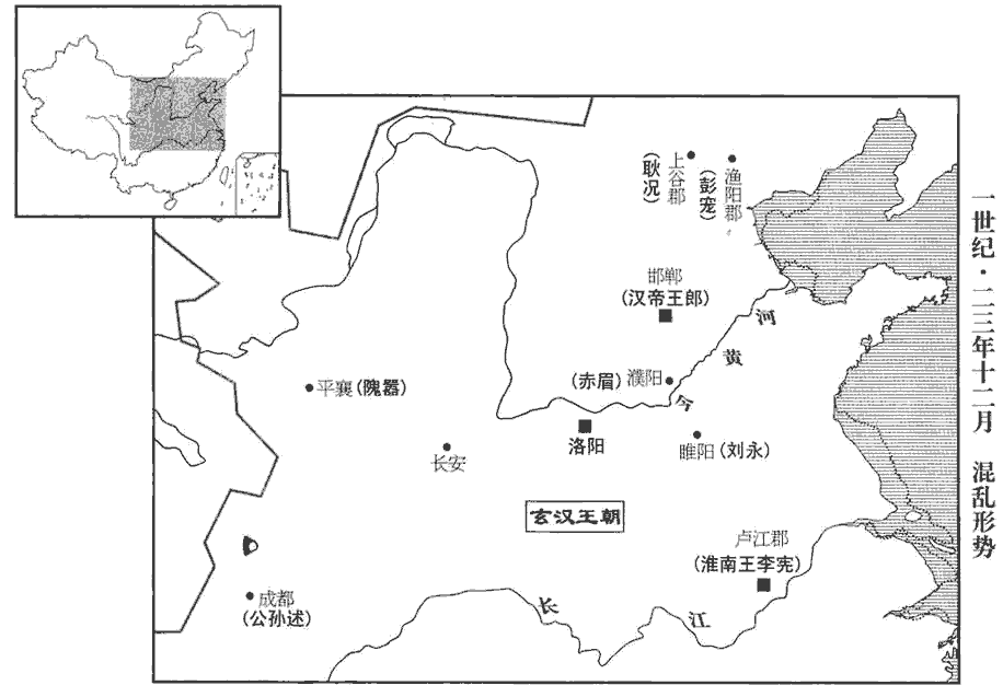 更始遣使立秀為蕭王,賢曰:蕭縣‹安徽萧县›,屬沛郡;今徐州縣也。悉令罷兵,與諸將有功者詣行在所;蔡邕獨斷曰:天子以四海為家,故謂所居為行在所。遣苗曾為幽州‹河北北部及辽宁›牧,韋順為上谷太守,蔡充為漁陽太守,并北之部。