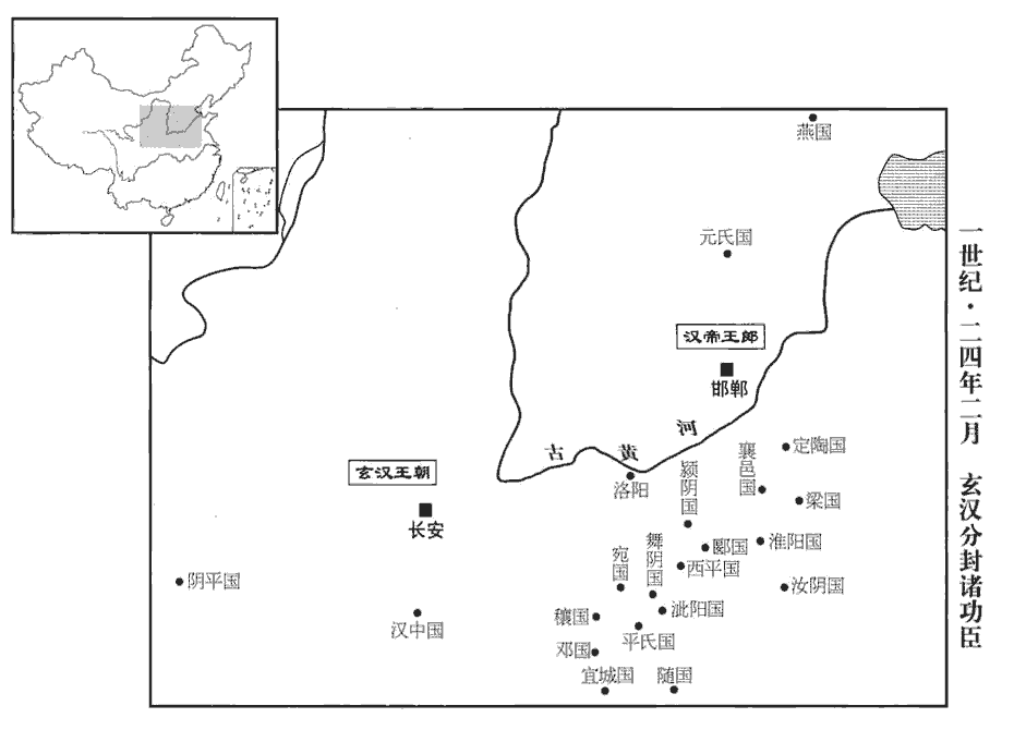 李松與棘陽‹河南南阳南›趙萌說更始宜悉王諸功臣;說,輸芮翻。王,於況翻。朱鮪wěi爭之,以為高祖約,非劉氏不王。鮪,於軌翻。更始乃先封諸宗室:祉為定陶王‹山东定陶›,班志:定陶縣,屬濟陰郡。宋白曰:定陶故城在曹州東北三十七里。慶為燕王‹北京›,燕,於賢翻。歙為元氏王‹河北元氏›,元氏縣,屬常山郡。闞駰曰:趙公子元之封邑,故曰元氏嘉為漢中王‹陕西汉中›,祉,舂陵康侯敞之子,大宗也。慶,敞之弟。嘉,敞之弟子。歙,更始之叔父。歙,許及翻。賜為宛王‹河南南阳›,宛縣,屬南陽郡。宋白曰:鄧州南陽縣,漢之宛縣。信為汝陰王‹安徽阜阳›;班志,汝陰縣屬汝南郡,故胡國;唐潁州治所。然後立王匡為泚zǐ陽王‹河南泌阳›,「泚陽」,後漢書作「比陽」。比陽縣,屬南陽郡;唐屬唐州。王鳳為宜城王‹湖北宜城›,班志,宜城縣屬南郡,故鄢。宋為大堤之地,立華山郡;後魏改宜城郡;唐為縣,屬襄州。朱鮪為膠東王‹山东平度›,膠東,漢王國,都即墨。賢曰:故城在今萊州膠水縣東南。王常為鄧王‹湖北襄樊汉水北岸›,鄧縣,屬南陽郡,故鄧國;唐為鄧城縣,屬襄州。申屠建為平氏王‹河南桐柏西北平氏镇›,班志,平氏縣屬南陽郡,有桐柏山;唐為桐柏縣,屬唐州。陳牧為陰平王‹甘肃文县›,賢曰:陰平縣,屬廣漢郡。宋白曰:唐文州曲水縣,漢陰平道也。衛尉大將軍張卬為淮陽王‹河南淮阳›,淮陽,本陳國;漢為淮陽國。賢曰:淮陽故城,在今陳州宛丘縣東南。執金吾大將軍廖湛為穰王‹河南邓州›,穰縣,屬南陽郡。師古曰:今鄧州穰縣是也。尚書胡殷為隨王‹湖北随州›,隨縣,屬南陽郡,古隨國;唐為隨州。柱天大將軍李通為西平王‹河南舞钢东北›,賢曰:西平縣,屬汝南郡;故城在今豫州郾城縣南。五威中郎將李軼為舞陰王‹河南泌阳北›,舞陰縣,屬南陽郡。宋白曰:唐州泌陽縣,本漢舞陰縣地。舞陽故城在葉縣東十里。水衡大將軍成丹為襄邑王‹河南睢县›,襄邑縣,屬陳留郡。國圈稱曰:襄邑,宋地,本承匡襄陵鄉也。宋襄公所葬,故曰襄陵。秦始皇以承匡卑濕,徙縣於襄陵,故曰襄邑。縣西十里有承匡故城。賢曰:今襄邑縣在宋州西。驃騎大將軍宗佻tiāo為潁陰王‹河南许昌›,佻,他彫翻,又田聊翻。班志,潁陰縣,屬潁川郡。尹尊為郾yǎn王‹河南郾城›。班志,郾縣,屬潁川郡。宋白曰:七國時,魏之下邑,今許州郾城縣是也。括地志:豫州褒信縣,本漢郾縣地。師古曰:郾,一戰翻。唯朱鮪辭不受;乃以鮪為左大司馬,宛王賜為前大司馬,使與李軼等鎮撫關東‹崤山之東›。又使李通鎮荊州‹湖南湖北›,王常行南陽‹河南南陽›太守事。以李松為丞相,趙萌為右大司馬,共秉內任。內任,謂朝廷之內。