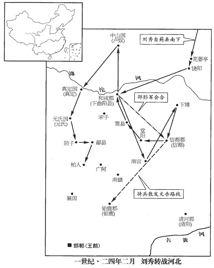 秀以二郡兵弱,欲入城頭子路、力子都軍中;爰曾起兵盧城頭,曾字子路,故號城頭子路。考異曰:范書作「力子都」。同編修劉攽bān曰:「力」當作「刁」,音彫。任光以為不可。乃發傍縣,得精兵四千人,拜任光為左大將軍,信都都尉李忠為右大將軍,邳肜róng為後大將軍;和戎太守如故,信都令萬脩為偏將軍,萬,姓也。孟子弟子有萬章。皆封列侯。留南陽宗廣領信都太守事,使任光、李忠、萬脩將兵以從。從,才用翻;下使從同。邳肜將兵居前,任光乃多作檄文曰:「大司馬劉公將城頭子路、力子都兵百萬眾從東方來,擊諸反虜!」遣騎馳至钜鹿‹河北平鄉›界中。吏民得檄,傳相告語。傳,知戀翻。語,牛倨翻。秀投暮入堂陽‹河北新河›界,賢曰:堂陽縣,屬钜鹿郡,在堂水之陽;故城在今冀州鹿城縣南。多張騎火,彌滿澤中,堂陽即降;又擊貰shì縣‹河北辛集西南›,降之。賢曰:貰縣,屬钜鹿郡;音時夜翻;師古音式制翻。城頭子路者,東平‹山東東平东南›爰曾也,寇掠河、濟間,有眾二十餘萬,濟,子禮翻。力子都有眾六七萬,故秀欲依之。昌城‹河北冀县西北›人劉植聚兵數千人據昌城,迎秀;賢曰:昌城縣,屬信都郡;故城在今冀州西北。杜佑曰:故城在冀州信都縣北。水經註引應劭曰:在堂陽縣北三十里。秀以植為驍騎將軍。耿純率宗族賓客二千餘人,老病者皆載木自隨,賢曰:左傳曰:又如是而嫁,將就木焉。木,謂棺也。老病者恐死,故載以從軍。迎秀於育;賢曰:育,縣名;故城在冀州。余考兩漢志無育縣,蓋「貰」字之誤。拜純為前將軍。進攻下曲陽‹河北晉州西›,降之;眾稍合,至數萬人,復北擊中山‹河北定州›。賢曰:中山國,一名中人亭;故城在今定州唐縣東北。張曜中山記曰:城中有山,故曰中山也。復,扶又翻。耿純恐宗家懷異心,乃使從弟訢宿歸,燒廬舍以絕其反顧之望。