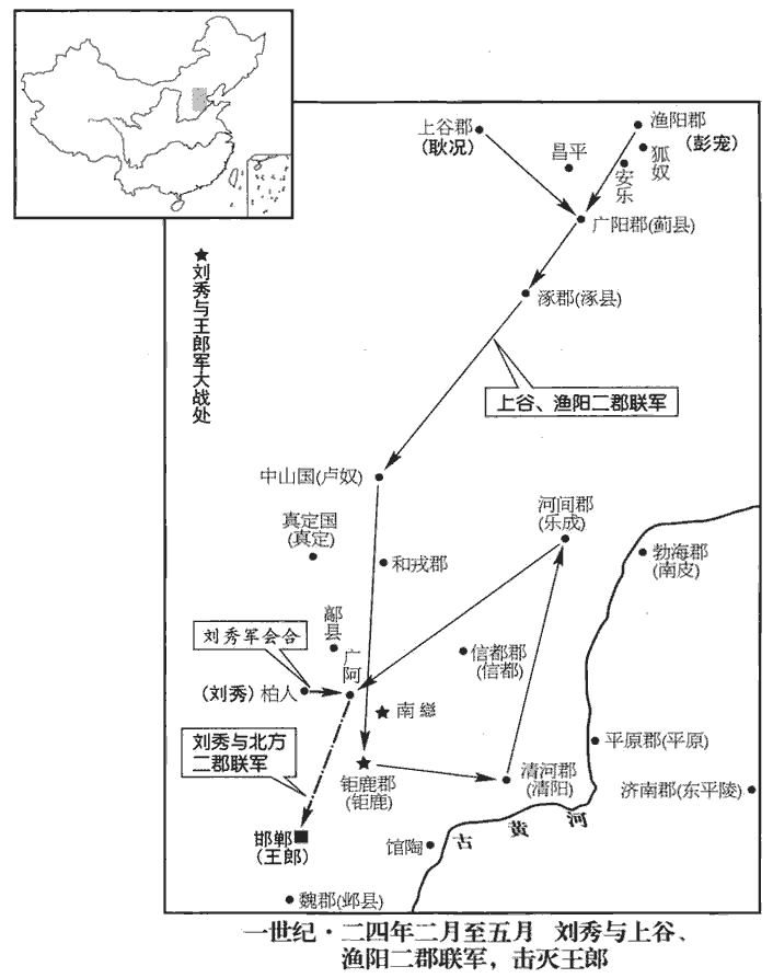 寇恂還,遂與上谷‹河北懷來›長史景丹及耿弇yǎn將兵俱南,與漁陽軍合,所過擊斬王郎大將、九卿、校尉以下,凡斬首三萬級,定涿郡‹河北涿州›、中山‹河北定州›、钜鹿‹河北平鄉›、清河‹河北清河›、河間‹河北獻縣›凡二十二縣。前及廣阿‹河北隆尧东›,聞城中車騎甚眾,丹等勒兵問曰:「此何兵?」曰:「大司馬劉公也。」諸將喜,即進至城下。城下初傳言二郡兵為邯鄲來,為,於偽翻;下同。眾皆恐。劉秀自登西城樓勒兵問之;耿弇拜於城下,即召入,具言發兵狀。秀乃悉召景丹等入,笑曰:「邯鄲將帥數言我發漁陽、上谷兵,數,所角翻;下同。吾聊應言『我亦發之』,賢曰:王郎將帥數云欲發二郡兵以拒光武,光武聊亦應云然,猶今兩軍相戲弄也。孔穎達曰:聊,且略之辭。何意二郡良為吾來!考異曰:袁紀作「良牧為吾來」,今從景丹傳。韻釋:良,首也,信也。方與士大夫共此功名耳。」乃以景丹、寇恂、耿弇、蓋延、吳漢、王梁皆為偏將軍,使還領其兵,加耿況、彭寵大將軍;封況、寵、丹、延皆為列侯。