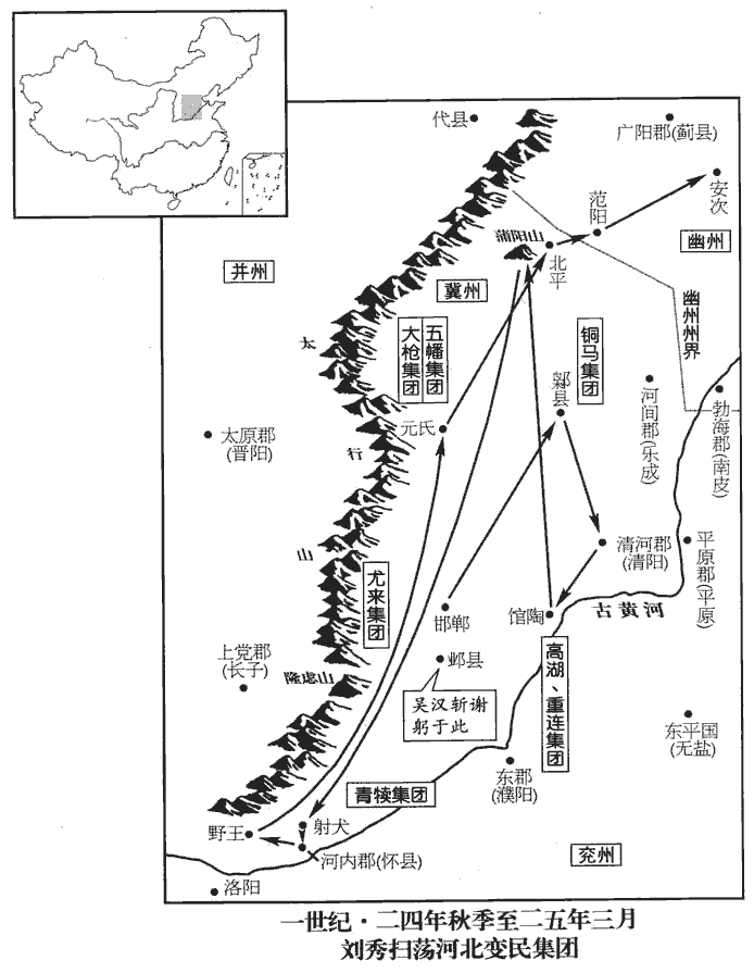 是時,諸賊銅馬、大彤、高湖、重連、鐵脛jìng、大槍、尤來、上江、青犢、五校、五幡、五樓、富平、獲索等各領部曲,眾合數百萬人,賢曰:諸賊或以山川土地為名,或以軍容強盛為號。銅馬賊帥東山荒禿、上淮況等,大彤渠帥樊重,尤來渠帥樊崇,五校賊帥高扈,檀鄉賊帥董次仲,五樓賊帥張文,富平賊帥徐少,獲索賊帥古師郎等,并見東觀記。脛,形定翻。富平,縣名,屬平原郡;今棣dì州厭次縣。所在寇掠。蕭王欲擊之,乃拜吳漢、耿弇俱為大將軍,持節北發幽州十郡突騎;幽州十郡,涿郡‹河北涿州›、廣陽‹北京›、代郡、上谷‹河北怀来›、漁陽‹北京密云›、遼西‹辽宁义县西›、遼東‹辽宁辽阳›、玄菟‹辽宁沈阳›、樂浪郡‹朝鲜平壤›是也。苗曾聞之,陰敕諸郡不得應調。賢曰:調,發也。調,徒弔翻。吳漢將二十騎先馳至無終‹天津蓟县›,賢曰:無終,本山戎國也,無終,山名,因以為國號;漢為縣名,屬右北平,故城在今幽州漁陽縣。是時苗曾蓋治無終。曾出迎於路,漢即收曾,斬之。耿弇到上谷‹河北懷來›,亦收韋順、蔡充,斬之。北州震駭,於是悉發其兵。