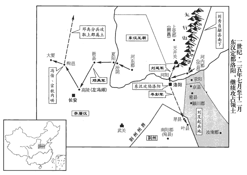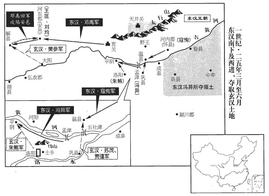 2鄧禹至箕jī關‹河南济源西›,賢曰:箕關,在今王屋縣東。余據唐王屋縣屬懷州。水經註:箕關故城在垣縣。擊破河東都尉,進圍安邑‹山西夏縣›。縣名,屬河東郡。