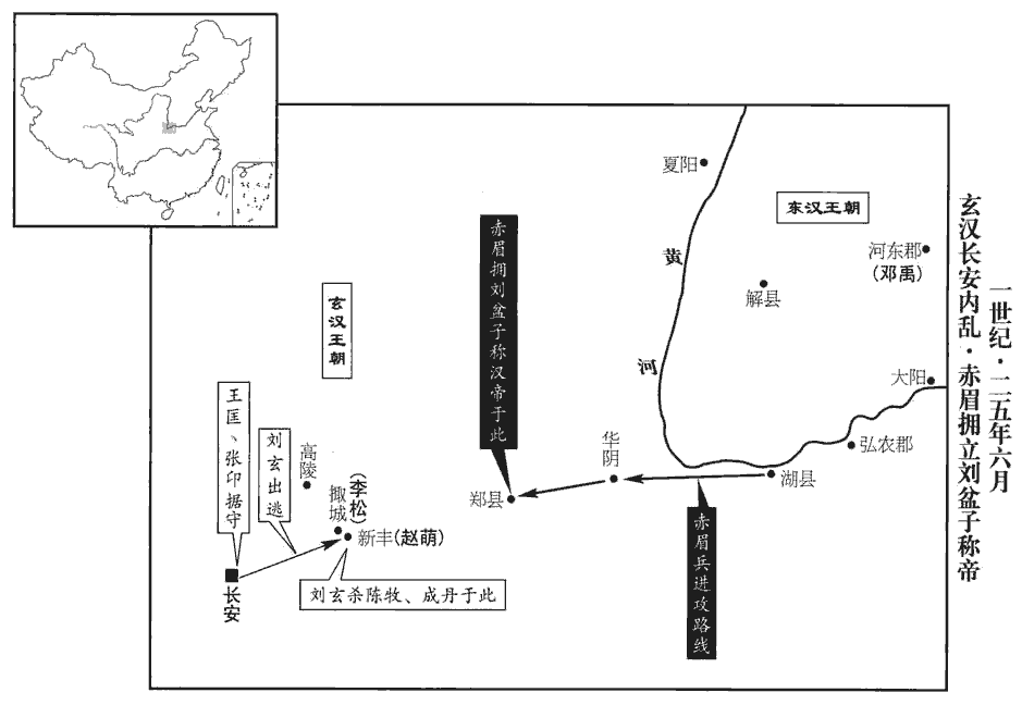 〖译文〗 [8]赤眉军进抵华阴,随军有一位齐地的巫师,常常击鼓舞蹈,祭祀城阳景王刘章。巫师口出狂言:“景王大怒说:‘应当做天子,为什么当盗贼!’”凡是嘲笑巫师的人,都患了病,为此全军震惊。方望的弟弟方阳劝说樊崇等人:“现在将军拥有百万大军,向西面对帝王都城,却没有称号,被人称作盗贼,不可能长期维持下去。不如拥立一位刘氏宗室,挟天子的名义诛杀讨伐,以此号令天下,谁敢不服从!”樊崇等认为说得很对,而巫师的狂言也越来越厉害。向前进军抵达郑县,于是共同商议说:“现在已经逼近长安,而鬼神的旨意是这样,应该寻求一位刘氏宗室,共同尊他为皇帝。”