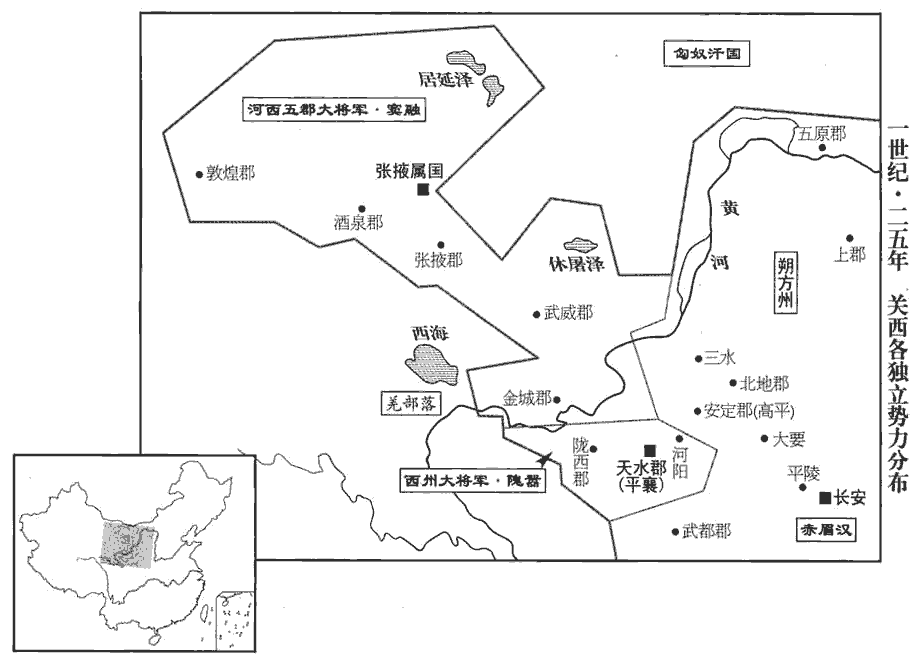 24初,平陵竇融累世仕宦河西,知其土俗,與更始右大司馬趙萌善,私謂兄弟曰:「天下安危未可知;河西殷富,帶河為固,張掖屬國精兵萬騎,漢邊郡皆置屬國,有都尉以領之。一旦緩急,杜絕河津,足以自守,此遺種處也!」賢曰:遺,留也。可以保全,不畏絕滅。種,章勇翻。乃因萌求往河西。萌薦融於更始,以為張掖屬國都尉。融既到,撫結雄桀,懷輯羌虜,輯,和也。甚得其歡心。是時,酒泉太守安定‹宁夏固原›梁統、姓譜:梁姓,本自秦仲;周平王封其少子康於夏陽梁山,是為梁伯。後為秦所併,子孫以國為氏。金城‹甘肅永靖西北›太守庫鈞、賢曰:前書音義曰:庫姓,即倉庫吏後也。今羌中有姓庫者,音舍,承鈞之後也。張掖都尉茂陵‹陝西興平东北›史苞、酒泉都尉竺曾、姓譜:竺,孤竹君之後,本姓竹。後漢擬陽侯竺晏報怨有仇,以冑始名賢,不改其族,乃加「二」字以存夷、齊。一曰:天竺國之後。敦煌都尉辛肜róng,敦,徒門翻。肜,餘中翻。并州郡英俊,融皆與厚善。及更始敗,融與梁統等計議曰:「今天下擾亂,未知所歸。河西斗絕在羌、胡中,賢曰:斗,峻絕也。余謂斗,僻絕也。不同心戮力,則不能自守,權鈞力齊,復無以相率,復,扶又翻。當推一人為大將軍,共全五郡,觀時變動。」議既定,而各謙讓。以位次,咸共推梁統;統固辭,乃推融行河西五郡大將軍事。武威太守馬期、張掖太守任仲任,音壬。并孤立無黨,乃共移書告示之;二人即解印綬去。於是以梁統為武威太守,史苞為張掖太守,竺曾為酒泉太守,辛肜róng為敦煌太守。融居屬國,領都尉職如故;置從事,監察五郡。監,古銜翻。河西民俗質樸,而融等政亦寬和,上下相親,晏然富殖;脩兵馬,習戰射,明烽燧,羌、胡犯塞,融輒自將與諸郡相救,皆如符要,賢曰:赴敵不失期契也。將,即亮翻。每輒破之。其後羌、胡皆震服親附,內郡流民避凶饑者歸之不絕。