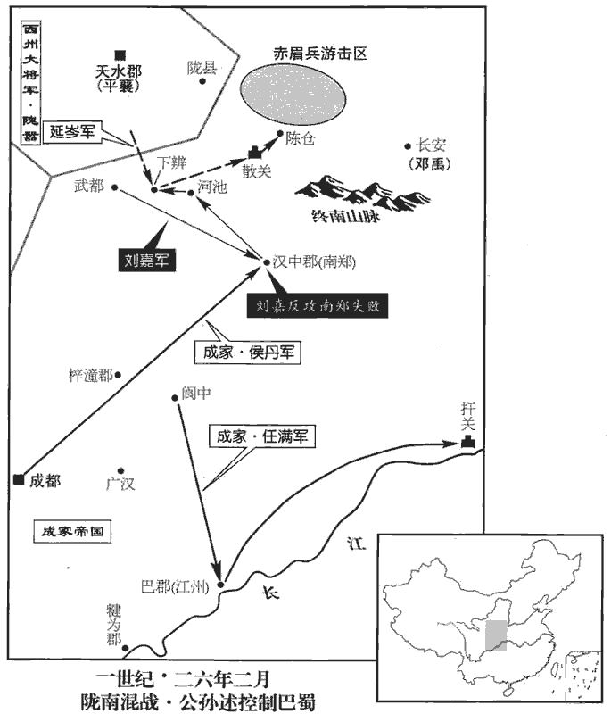 公孫述又遣將軍任滿從閬中‹四川閬中›下江州‹四川重庆›,東據扞關‹四川奉節東›,賢曰:閬中、江州,皆縣名,并屬巴郡。閬中,今隆州縣也。江州故城,在渝州巴縣西。宋白曰:今渝州江津縣,本漢江州縣。史記曰:楚肅王為扞關以拒蜀,故基在今峽州巴山縣。於是盡有益州‹四川及云南›之地。漢益州部漢中、巴郡、廣漢、蜀郡、犍為、牂柯、越巂、益州等郡。