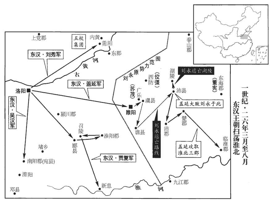 26蓋延圍睢陽‹河南商丘›數月,克之。蓋,古盍翻。劉永走至虞‹河南虞城北›,賢曰:虞縣,屬梁國;故城在今宋州虞城縣。虞人反,殺其母、妻;永與麾下數十人奔譙qiáo‹安徽亳州›。地理志,譙縣,屬沛郡。賢曰:今亳州縣。蘇茂、佼彊、周建合軍三萬餘人救永;延與戰於沛‹安徽淮北›西,地理志,沛縣,屬沛郡。賢曰:今徐州縣。佼,音絞,又音効。大破之。永、彊、建走保湖陵‹山東魚台东南›,地理志,湖陵縣,屬山陽郡。茂奔還廣樂‹河南虞城北›;延遂定沛‹安徽淮北›、楚‹江苏徐州›、臨淮‹江苏泗洪南›。三郡也。