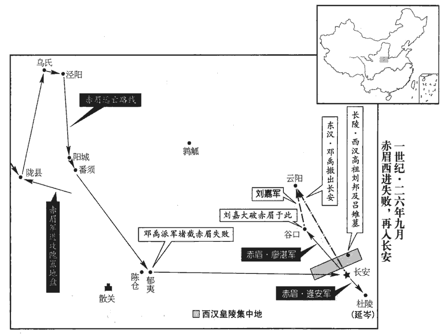 31赤眉引兵欲西上隴‹甘肅张家川›,隴縣,屬天水郡;有大阪,名隴坻。三秦記曰:其阪九回,不知高幾許,欲上者七日乃越;高處可容百餘家,清水四注下。郭仲產秦州記曰:隴山東西百八十里,登山嶺,東望秦川,四五百里,極目泯然。山東人行役,升此而顧贍者,莫不悲思,故歌曰:「隴頭流水,分離四下。念我行役,飄然曠野。登高遠望,涕零雙墮。」渡汧qiān、隴,無蠶桑;八月乃麥,五月乃凍解。隗囂遣將軍楊廣迎擊,破之;又追敗之於烏氏‹宁夏隆德东北›、涇陽‹甘肅平涼西北›間。烏氏、涇陽二縣,屬安定郡。賢曰:烏氏故城,在今涇州安定縣東四十里。涇陽故城,在今原州平高縣之南。敗,補邁翻。氏,音支。赤眉至陽城番須‹陝西隴縣西北›中,酈道元曰:陽城在安民縣。成帝永始二年,罷安定呼他苑以為安民縣。賢曰:番須口與回中相近,并在汧qiān。番,音盤。逢大雪,坑谷皆滿,士多凍死;乃復還,發掘諸陵,復,扶又翻;下同。取其寶貨。凡有玉匣殮者,率皆如生;殮,力贍翻。賊遂汙辱呂后尸。汙,烏故翻。關中記:呂后合葬長陵。高祖陵在西,呂后陵在東。鄧禹遣兵擊之於鬱夷‹陝西宝鸡西›,地理志,鬱夷縣,屬右扶風。反為所敗;敗,補邁翻。禹乃出之雲陽‹陝西淳化西北›。地理志,雲陽縣,屬左馮翊。赤眉復入長安。延岑屯杜陵‹陝西西安東南›,賢曰:縣名,屬京兆,周之杜伯國;在今萬年縣東南。赤眉將逢安擊之。鄧禹以安精兵在外,引兵襲長安;會謝祿救至,禹兵敗走。延岑擊逢安,大破之,逢,音龐。死者十餘萬人。