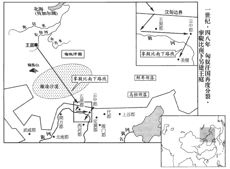 6冬,南匈奴五骨都侯子復將其眾三千人歸南部,北單于使騎追擊,悉獲其眾。南單于遣兵拒之,逆戰不利,於是復詔單于徙居西河‹内蒙准格尔旗西南›、美稷‹內蒙准格爾旗›,復,扶又翻。因使段彬、王鬱留西河‹内蒙准格尔旗西南›擁護之,使匈奴中郎將自是亦屯西河美稷。杜佑曰:汾州隰xí城縣有美稷鄉,即漢美稷縣也。隰城,漢之茲氏縣也。令西河長史歲將騎二千、弛刑五百人助中郎將衛護單于,冬屯夏罷,自後以為常。南單于既居西河,亦列置諸部王,助漢扞戍北地、朔方、五原、雲中、定襄、鴈門、代郡,皆領部眾,為郡縣偵邏耳目。偵,丑鄭翻。賢曰:邏,音力賀翻。北單于惶恐,頗還所掠漢民以示善意,鈔兵每到南部下,鈔,楚交翻。還過亭候,輒謝曰:「自擊亡虜薁yù鞬日逐耳,薁,於六翻。鞬,居言翻。非敢犯漢民也。」