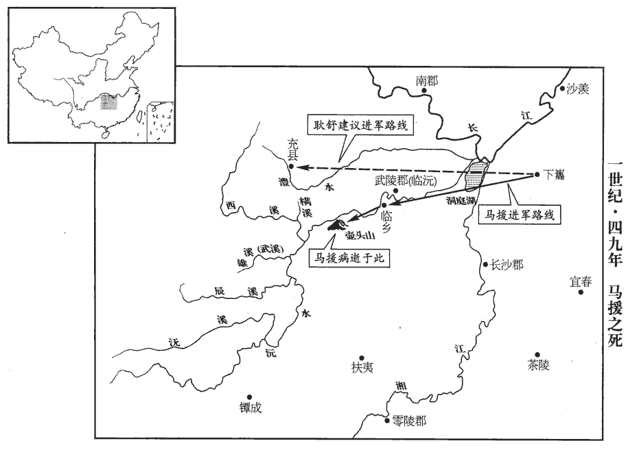 4馬援軍至臨鄉‹湖南桃源›,水經註:武陵郡沅南縣,建武中所置縣,在沅水之陰,因以沅南為名,縣治故城,昔馬援討臨鄉所築也。擊破蠻兵,斬獲二千餘人。