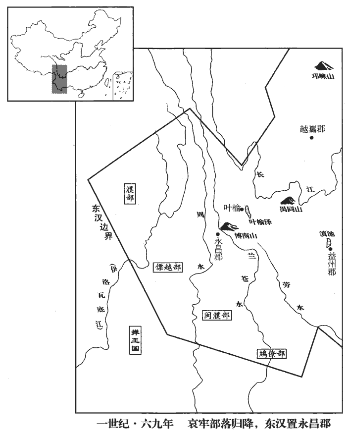 1春,哀牢‹云南南›王柳貌率其民五萬餘戶內附,以其地置哀牢‹云南保山›、博南‹云南永平›二縣。哀牢夷者,九隆種也,居牢山,絕域荒外,山川阻深,未嘗通中國,西南去雒陽七千里。賢曰:在今匡州匡州縣西。張柬之曰:姚州,哀牢國地。始通博南山‹云南永平境›,度蘭倉水‹瀾滄江›,華陽國志曰:博南縣西山高三十里,越之,得蘭倉水,有金沙,洗取融為金。行者苦之,歌曰:「漢德廣,開不賓;度蘭倉,為他人。」為,於偽翻。