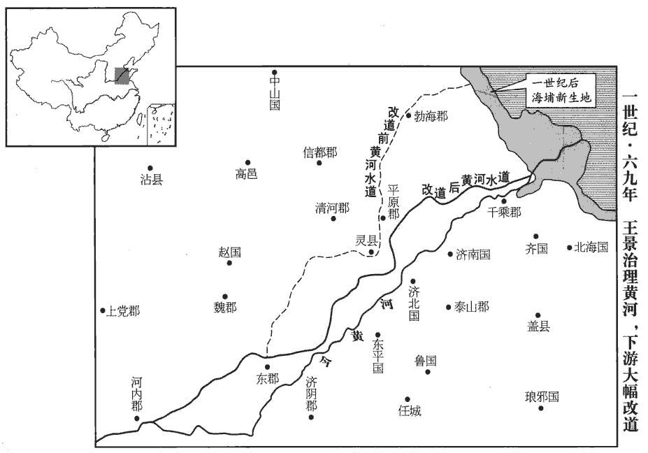 2初,平帝時,河、汴決壞,久而不脩。建武十年,光武欲脩之;浚儀‹河南開封›令樂俊上言,民新被兵革,未宜興役,乃止。浚儀縣,屬陳留郡。被,皮義翻。其後汴渠東侵,日月彌廣,兗‹山東西部›、豫‹河南›百姓怨歎,以為縣官恆興他役,不先民急。會有薦樂浪‹朝鮮平壤›王景能治水者,樂浪,在雒陽東北五千里。恆,戶登翻。先,悉薦翻。樂浪,音洛琅。夏,四月,詔發卒數十萬,遣景與將作謁者王吳脩汴渠隄,自滎陽‹河南滎陽›東至千乘‹山東高青东北›海口千餘里,謁者,屬光祿勳。王吳以謁者而將作,故謂之將作謁者。賢曰:汴渠,即莨làng蕩渠也。汴自滎陽首受河,所謂石門,在滎陽山北一里,過汴以東,積石為隄,亦號金隄,成帝陽嘉中所作也。十里立一水門,令更相洄注,爾雅曰:逆流而上曰洄。郭璞註云:旋流也。更,工衡翻。無復潰漏之患。復,扶又翻。景雖簡省役費,然猶以百億計焉。十萬曰億。