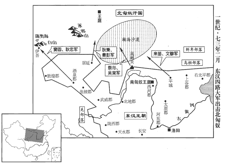 4謁者僕射耿秉數上言請擊匈奴,百官志:謁者僕射,秩比千石,為謁者臺率,主謁者。古重習武,有主射以督錄之,故曰僕射。數,所角翻。上以顯親侯竇固嘗從其世父融在河西‹甘肅中、西部›,爾雅曰:父之昆弟,先生為世父,後生為叔父。明習邊事,乃使秉、固與太僕祭肜róng、虎賁中郎將馬廖、廖,音聊。下博侯劉張、張,齊王縯之孫。好畤zhì侯耿忠等共議之。畤,音止。耿秉曰:「昔者匈奴援引弓之類,援,於元翻。并左衽之屬,故不可得而制。孝武既得河西四郡及居延‹内蒙额济纳旗›、朔方‹內蒙杭锦旗北黄河南岸›,居延,武帝置縣,屬張掖郡。賢曰:故城在今甘州張掖縣北。虜失其肥饒畜兵之地,羌、胡分離;唯有西域,俄復內屬;復,扶又翻。故呼韓邪單于請事款塞,其勢易乘也。易,以豉翻。今有南單于,形勢相似;然西域尚未內屬,北虜未有舋xìn作。臣愚以為當先擊白山‹新疆哈密北天山›,西河舊事曰:白山冬夏有雪,故曰白山,匈奴謂之天山,過之,皆下馬拜焉,去蒲類海百里之內。得伊吾‹新疆哈密›,賢曰:伊吾即伊吾盧地,本屬匈奴,後取其地置宜禾都尉,以為屯田,今伊州納職縣伊吾故城是也。又曰:伊吾故城,在今瓜州晉昌縣北。破車師‹新疆吐魯番›,通使烏孫‹都赤谷城,中亚伊赛克湖东南›諸國以斷其右臂;使,疏吏翻。斷,丁管翻。伊吾亦有匈奴南呼衍一部,破此,復為折其左角,復,扶又翻。折,而設翻。然後匈奴可擊也。」上善其言。議者或以為「今兵出白山,匈奴必并兵相助,又當分其東以離其眾。」上從之。十二月,以秉為駙馬都尉,固為奉車都尉;以騎都尉秦彭為秉副,三都尉皆武帝置,奉車都尉掌乘輿,駙馬都尉掌天子之副馬。師古曰:駙,副也;一曰,近也,疾也。耿忠為固副,皆置從事、司馬,出屯涼州‹甘肅›。秉,國之子;忠,弇yǎn之子;廖,援之子也。