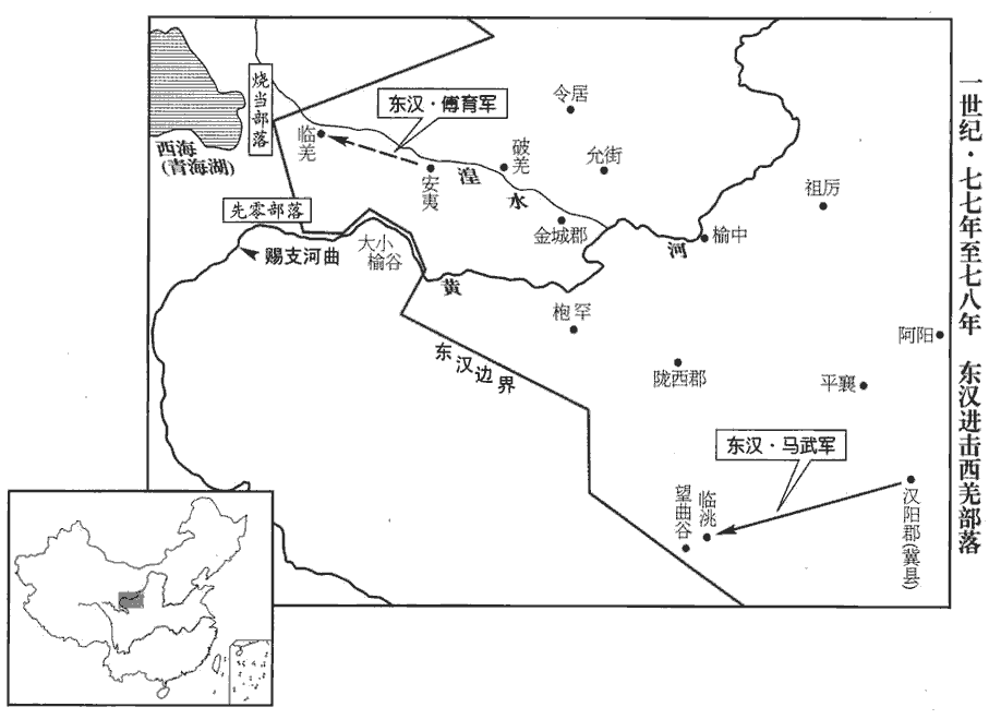 5初,安夷‹青海平安›縣吏略妻卑湳nǎn種羌人婦,安夷縣屬金城郡。杜預曰:不以道取曰略。湳,乃感翻。種,章勇翻;下同。吏為其夫所殺,安夷長宗延追之出塞。長,知兩翻。種人恐見誅,遂共殺延而與勒姐、吾良二種相結為寇。勒姐羌居勒姐溪,因以為種名。於是燒當‹青海湟中一带›羌豪滇吾之子迷吾率諸種俱反,姐,子也翻,又音紫。滇,音顛。敗金城‹甘肅永靖西北›太守郝崇。敗,補邁翻。郝,呼各翻;姓譜:殷帝乙有子期,封太原郝鄉,後因氏焉。詔以武威‹甘肅武威›太守北地‹寧夏吴忠西南金积镇›傅育為護羌校尉,自安夷‹青海西寧東›徙居臨羌‹青海湟源›。臨羌縣,屬金城郡。杜佑曰:臨羌在今西平郡。水經註:湟水東合安夷川水,又東逕安夷縣,故城在漢西平亭東七十里。湟水又東合勒姐溪水。迷吾又與封養種豪布橋等五萬餘人共寇隴西‹甘肅臨洮›、漢陽‹甘肅甘谷›。本天水郡,明帝永平十七年,改名漢陽。秋,八月,遣行車騎將軍馬防、長水校尉耿恭將北軍五校兵武帝置北軍八校,中壘、屯騎、越騎、長水、胡騎、射聲、步兵、虎賁也;中興,省中壘、胡騎、虎賁,惟越騎、屯騎、步兵、長水、射聲五校。屯騎、越騎、步兵、射聲各領士七百人,長水領烏桓胡騎七百三十六人,皆宿衛兵也。及諸郡射士三萬人擊之。馬防傳云:積射士。第五倫上疏曰:「臣愚以為貴戚可封侯以富之,不當任以職事。何者?繩以法則傷恩,私以親則違憲。伏聞馬防今當西征,臣以太后恩仁,陛下至孝,恐卒有纖介,難為意愛。」賢曰:恐卒然有小過,愛而不罰,則廢法也。卒,讀曰猝。帝不從。