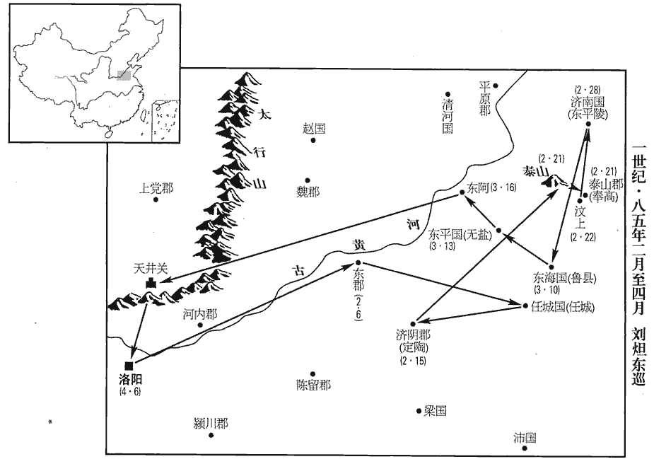 5帝之為太子也,受尚書於東郡‹河南濮陽西南›太守汝南‹河南平舆西北射桥乡›張酺pú。續漢志:東郡,去雒陽八百餘里。酺,薄乎翻。丙辰‹六›,帝東巡,幸東郡‹河南濮陽西南›,引酺及門生并郡縣掾史并會庭中。東郡庭也。掾,俞絹翻。帝先備弟子之儀,使酺講尚書一篇,然後脩君臣之禮;賞賜殊特,莫不沾洽。行過任城‹山東濟寧东南›,幸鄭均舍,賜尚書祿以終其身,時人號為「白衣尚書」。先是,均事帝為尚書,數納忠言,帝敬重之,謝病歸任城,今祿以尚書。任,音壬。