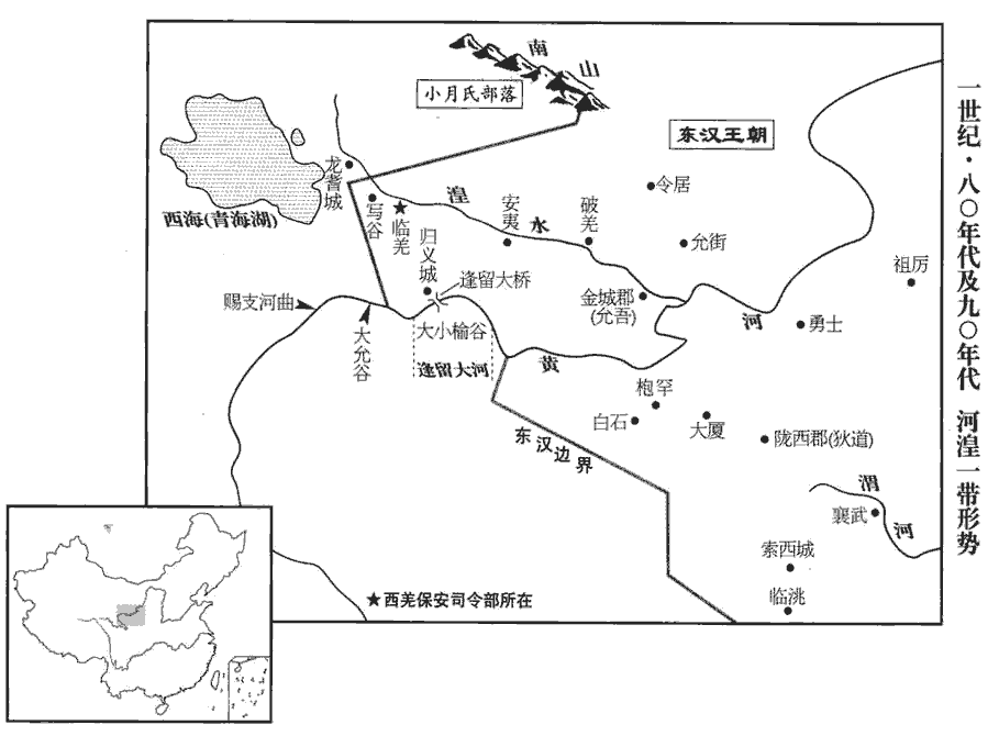 6燒當羌‹青海湟中一带›迷吾復與弟號吾及諸種反。復,扶又翻。種,章勇翻。號吾先輕入,寇隴西‹甘肅臨洮›界,督烽掾李章追之,督烽掾,郡掾之督烽燧者。生得號吾,將詣郡。號吾曰:「獨殺我,無損於羌;誠得生歸,必悉罷兵,不復犯塞。」隴西太守張紆放遣之,羌即為解散,為,於偽翻。各歸故地。迷吾退居河北‹青海貴德至尖扎县段黃河称逢留大河›歸義城‹青海贵德东北›。河北,逢留大河之北也。歸義城,本漢所築,以招來諸羌之歸義者。