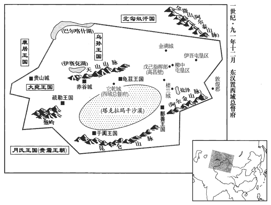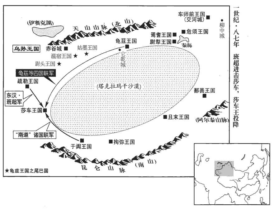 6龜茲‹新疆庫車›、姑墨‹新疆阿克苏西北›、溫宿‹新疆烏什›諸國皆降。降,戶江翻。十二月,復置西域都護騎都尉、戊己校尉官。章帝建初元年,罷西域都護及戊己校尉官,今復置。復,扶又翻。以班超為都護,徐幹為長史。拜龜茲侍子白霸為龜茲王,遣司馬姚光送之。超與光共脅龜茲,廢其王尤利多而立白霸,使光將尤利多還詣京師。將,如字。超居龜茲它乾城,徐幹屯疏勒‹新疆喀什›,惟焉耆‹新疆焉耆›、危須‹新疆和碩縣›、尉犁‹新疆博湖›以前沒都護,事見四十五卷明帝永平十八年。猶懷二心,為班超誅焉耆、尉犁王張本。其餘悉定。言其餘諸國皆臣服於漢也。