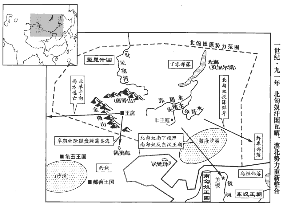 2北匈奴‹王庭设蒙古哈尔和林›大人車利涿兵等車,昌遮翻。亡來入塞,凡七十三輩。時北虜衰耗,黨眾離畔,南部攻其前,丁零‹貝加爾湖地區›寇其後,鮮卑‹內蒙西辽河上游›擊其左,西域侵其右,不復自立,復,扶又翻。乃遠引而去‹王庭西迁至西海,蒙古科布多东哈腊湖›。