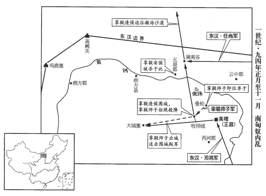 〖译文〗 [7]南匈奴单于师子即位后,有五六百投降的北匈奴人乘夜袭击师子。安集掾王恬率领卫士迎战,将他们击败。于是投降的北匈奴人互相惊扰,十五个部落、二十余万人全部叛变。他们胁迫前单于屯屠何的儿子日逐王逢侯,将他立为单于。然后,屠杀抢劫官吏百姓,焚烧邮亭和庐帐,带着辎重前往朔方,打算穿越大漠北去。九月癸丑(疑误),和帝命光禄勋邓鸿代理车骑将军职务,同越骑校尉冯柱、代理度辽将军朱徽一道率领左右羽林军、北军五校士及各郡各封国的弓箭手、边郡士兵,另由乌桓校尉任尚率领乌桓、鲜卑部队,共计四万人,进行讨伐。当时,南匈奴单于和中郎将杜崇驻扎在牧师城,逢侯率领万余骑兵向他们发动围攻。冬季,十一月,邓鸿等到达美稷,逢侯这才解围离去,向满夷谷行进。南单于派他的儿子率领一万骑兵及杜崇部下四千骑兵,会同邓鸿的部队,在大城塞追击逢侯,斩杀四千余人。任尚则率领鲜卑、乌桓兵在满夷谷进行截击,再次大败叛军。先后共斩杀一万七千余人。于是逢侯率领部众逃出塞外,汉军因无法追击而返回。