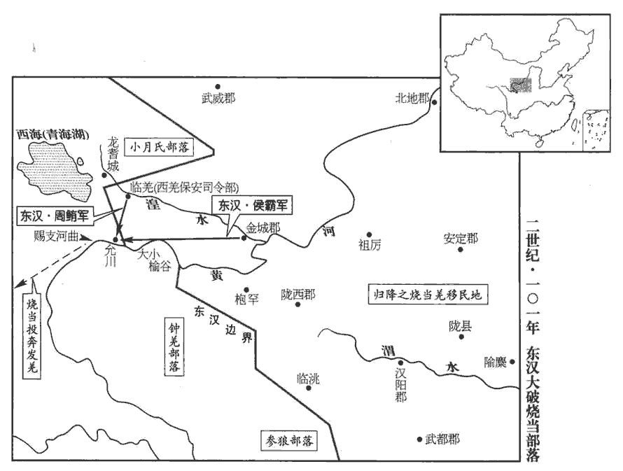 2迷唐復還賜支河曲‹青海共和东南黄河›,將兵向塞。護羌校尉周鮪wěi與金城太守侯霸金城郡在洛陽西二千八百里。鮪,於軌翻。及諸郡兵、屬國羌、胡合三萬人【章:甲十六行本「人」下有「出塞」二字;乙十一行本同;孔本同;張校同;退齋校同。】至允川‹青海貴德西›。水經註曰:允川去賜支河曲數十里,在大、小榆谷之西。侯霸擊破迷唐,種人瓦解,降者六千餘口,種,章勇翻。降,戶江翻。分徙漢陽‹甘肅甘谷›、安定‹宁夏鎮原›、隴西‹甘肅臨洮›。迷唐遂弱,遠踰賜支河首,依發羌‹青海中西部›居。發羌,羌之別種,或曰:唐之吐蕃即其後也。久之,病死,其子來降,戶不滿數十。