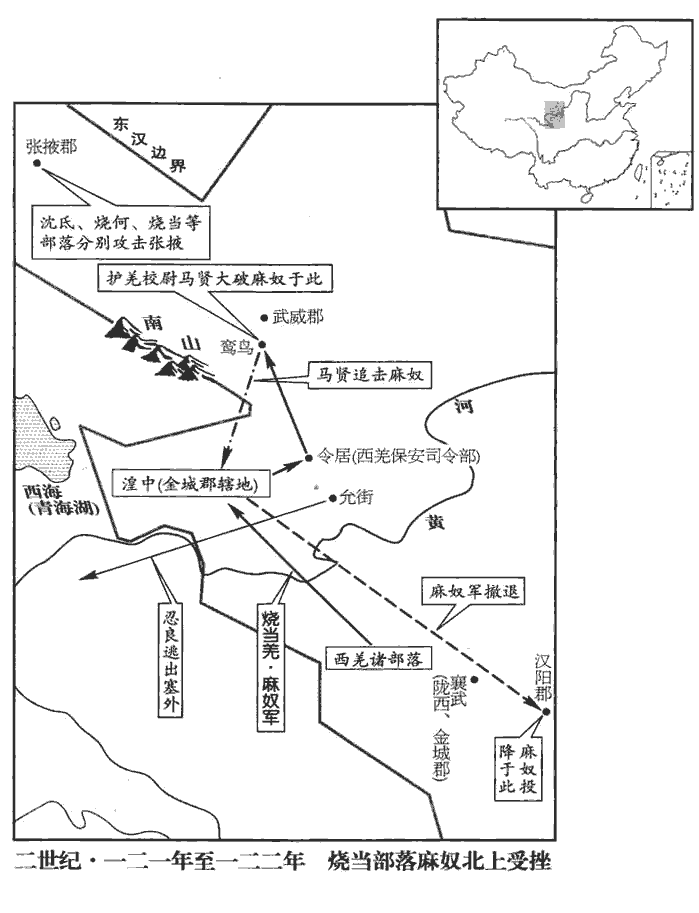 〖译文〗 [2]护羌校尉马贤追击羌人烧当部落首领麻奴,到达湟中地区,打败羌军,麻奴的部众纷纷逃散。