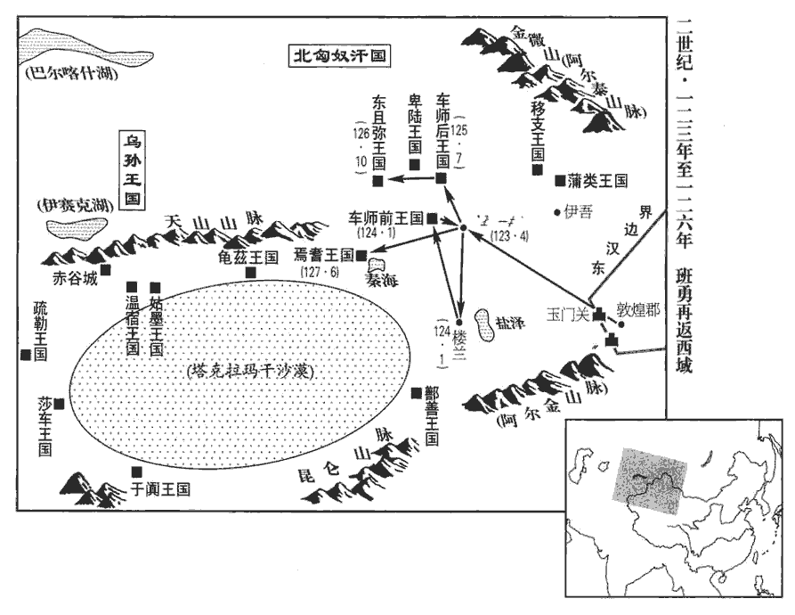 3北匈奴連與車師‹新疆吐鲁番›入寇河西‹甘肃中、西部›,議者欲復閉玉門、陽關以絕其患。賢曰:玉門、陽關,二關名也,在敦煌西界,皆在敦煌龍勒界。復,扶又翻;下同。敦煌太守張璫dāng上書曰:敦,徒門翻。「臣在京師,亦以為西域宜棄,今親踐其土地,乃知棄西域則河西不能自存。謹陳西域三策:北虜呼衍王常展轉蒲類‹新疆巴里坤县西北巴里坤湖›、秦海‹新疆博斯腾湖›之間,賢曰:大秦國在西海西,故曰秦海。余按蒲類海在唐庭州界。蓋此時北匈奴雖微弱,然東畏鮮卑,不敢還故地,但結連車師、鄯善以擾河西,故呼衍一部常為河西患。若賢註以大秦海西之國為秦海,則約言之耳。西海廣遠,甘英之不能越,北匈奴兵威所未嘗役屬;言展轉二海間,特當時上書者張言之耳。専制西域,共為寇鈔。今以酒泉屬國吏士二千餘人集崑崙塞‹甘肃安西›,賢曰:前書,敦煌郡廣至縣有崑崙障,宜禾都尉居也。廣至故城,在今瓜州常樂縣東。註又見四十五卷明帝永平十七年,與此稍異。先擊呼衍王,絕其根本,因發鄯善‹新疆若羌›兵五千人脅車師後部‹新疆吉木萨尔南›,此上計也。若不能出兵,可置軍司馬,將士五百人,四郡供其犁牛、穀食,出據柳中‹新疆鄯善西南鲁克沁城›,此中計也。四郡,武威、酒泉、張掖、敦煌。賢曰:柳中,今西州縣。余按西域傳:柳中在後部金蒲城之北,去交河城八十里。杜佑曰:唐平高昌,以田地城為柳中縣。鄯,上扇翻。如又不能,則宜棄交河城‹吐鲁番›,收鄯善‹新疆若羌›等悉使入塞,此下計也。」朝廷下其議。鄯,上扇翻。下,遐稼翻。陳忠上疏曰:「西域內附日久,區區東望扣關者數矣,此其不樂匈奴、慕漢之效也。數,所角翻。樂,音洛。今北虜已破車師‹吐鲁番›,勢必南攻鄯善‹新疆若羌›,棄而不救,則諸國從矣。言從北匈奴也。若然,則虜財賄益增,膽勢益殖,賢曰:殖,生也。威臨南羌,即湟中及南山諸羌。與之交通,如此,河西四郡危矣。河西既危,不可不救,則百倍之役興,不訾zī之費發矣。毛晃曰:訾之為言量也,不訾,謂無量可比也。訾,子斯翻。議者但念西域絕遠,卹之煩費,不見孝武苦心勤勞之意也。方今敦煌孤危,遠來告急;復不輔助,內無以慰勞吏民,勞,力到翻。外無以威示百蠻,蹙國減土,非良計也。臣以為敦煌宜置校尉,按舊增四郡屯兵,以西撫諸國。」帝納之,於是復以班勇為西域長史,賢曰:西域都護之長史也。余按班超未為都護,亦為將兵長史。敦,徒門翻。復,扶又翻;下同。將兵五百人出屯柳中‹新疆鄯善西南鲁克沁城›。