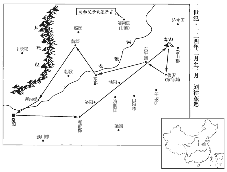2二月,丙子‹十三›,車駕東巡。辛卯‹二十八›,幸泰山。三月,戊戌‹五›,幸魯;還,幸東平,至東郡,歷魏郡‹河北临漳西南邺镇›、河內‹河南武陟›而還。還,從宣翻,又如字。