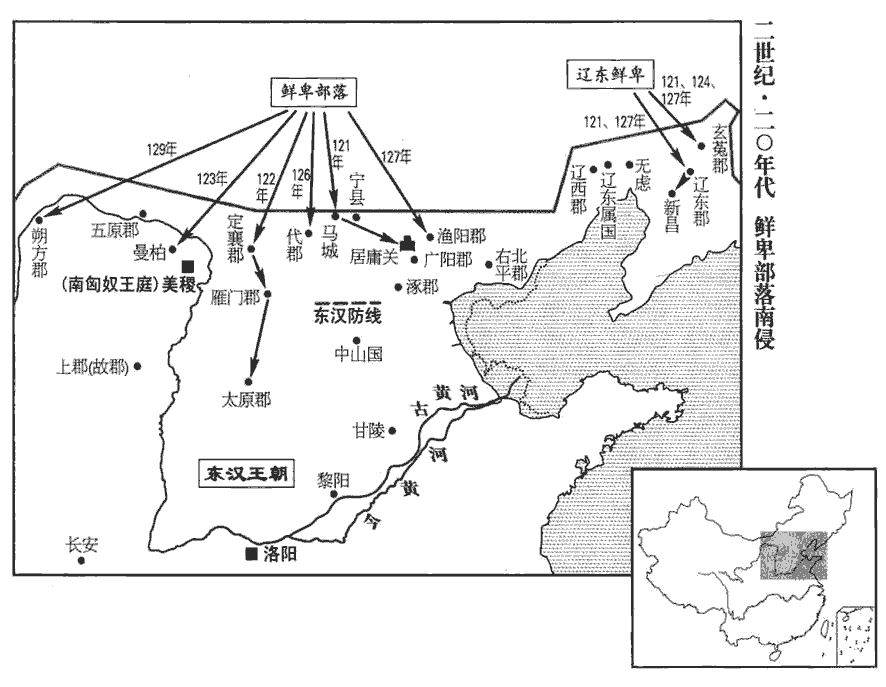9鲜卑寇朔方‹内蒙磴口›。