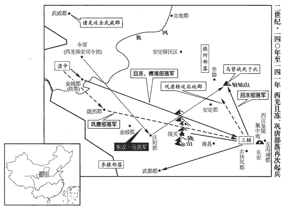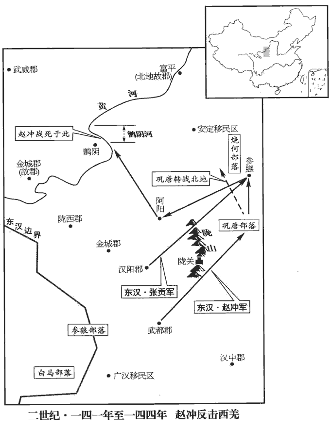 3冬,閏十月,趙沖擊燒當羌於阿陽‹甘肃静宁›,破之。賢曰:阿陽縣,屬漢陽郡;故城在今秦州隴城縣西北。