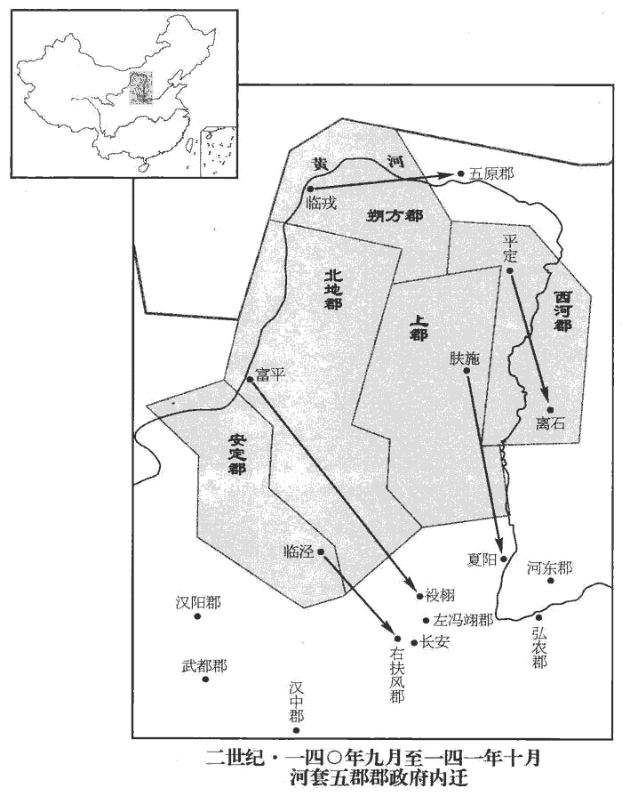 12冬,十月,癸丑‹二›,以羌寇充斥,涼‹甘肃›部震恐,復徙安定‹甘肃镇原东南曙光乡›居扶風‹陕西兴平›,北地‹宁夏吴忠西南金积镇›居馮翊‹陕西高陵›。永建四年,二郡還舊治,今復徙之。復,扶又翻。十一月,庚子‹二十›,以執金吾張喬行車騎將軍事,將兵萬五千人屯三輔。