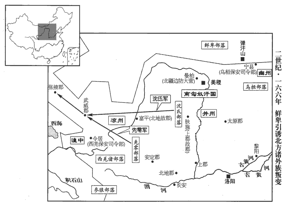 7鮮卑‹河北尚义南大青山›聞張奐去,招結南匈奴‹内蒙准格尔旗›及烏桓‹河北北部›同叛。六月,南匈奴、烏桓、鮮卑數道入塞,寇掠緣邊九郡。秋七月,鮮卑復入塞,誘引東羌‹甘肃陇西›與共盟詛。詛,莊助翻。於是上郡沈氐‹陕西北部›、安定先零諸種‹宁夏›種,章勇翻。共寇武威‹甘肃武威›、張掖‹甘肃张掖›,緣邊大被其毒。被,皮義翻。詔復以張奐為護匈奴中郎將,以九卿秩護匈奴中郎將,秩比二千石。九卿,秩中二千石。督幽‹河北北›、并‹山西›、涼‹甘肃›三州及度遼、烏桓二營,度遼將軍及護烏桓校尉營也。兼察刺史、二千石能否。