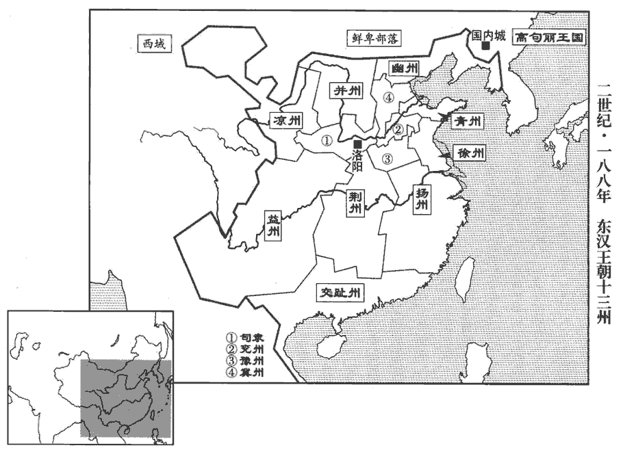 5太常江夏‹湖北新洲›劉焉見王室多故,建議以為:「四方兵寇,由刺史威輕,既不能禁,且用非其人,以致離叛。宜改置牧伯,選清名重臣以居其任。」焉內欲求交趾牧。以交趾僻遠,可以避禍也。侍中廣漢‹四川广汉›董扶扶學圖讖,何進薦之,徵拜侍中。私謂焉曰:「京師將亂,益州分野有天子氣。」蔡邕月令章句:自危十度至壁八度,謂之豕韋之次,衛之分野。自壁八度至胃一度,謂之降婁之次,魯之分野。自胃一度至畢六度,謂之大梁之次,趙之分野。自畢六度至井十度,謂之實沈之次,晉之分野。自井十度至柳三度,謂之鶉首之次,秦之分野。自柳三度至張十二度,謂之鶉火之次,周之分野。自張十二度至軫六度,謂之鶉尾之次,楚之分野。自軫六度至亢八度,謂之壽星之次,鄭之分野。自亢八度至尾四度,謂之大火之次,宋之分野。自尾四度至斗六度,謂之析木之次,燕之分野。自斗六度至須女二度,謂之星紀之次,越之分野。自須女二度至危十度,謂之玄枵xiāo之次,齊之分野。晉書天文志用後魏太史令陳卓所言郡國所入宿度,今亦載之:自軫十二度至氐四度為壽星,於辰在辰,鄭分,屬兗州。自氐五度至尾九度為大火,於辰在卯,宋分,屬豫州。自尾十度至南斗十一度為析木,於辰在寅,燕分,屬幽州。自南斗十二度至須女七度為星紀,於辰在丑,吳、越分,屬楊州。自須女八度至危十五度為玄枵,於辰在子,齊分,屬青州。自危十六度至奎四度为諏zōu訾zī,於辰在亥,衛分,属并州。自奎五度至胃六度为降娄,於辰在戌,鲁分,属徐州。自胃七度至畢十一度為大梁,於辰在酉,趙分,屬冀州。自畢十二度至東井十五度為實沈,於辰在申,魏分,屬益州。自東井十六度至柳八度為鶉首,於辰在未,秦分,屬雍州。自柳九度至張十六度為鶉火,於辰在午,周分,屬三河。自張十七度至軫十一度為鶉尾,於辰在巳,楚分,屬荊州。分,扶問翻。焉乃更求益州。會益州刺史郤xì儉賦斂煩擾,謠言遠聞,郤,乞逆翻。春秋晉大夫郤氏。考異曰:范書作「郗儉」,今從陳壽蜀志。斂,力贍翻。聞,音問。而耿鄙、張懿皆為盜所殺,朝廷遂從焉議,選列卿、尚書為州牧,各以本秩居任。列卿,秩中二千石;尚書,秩六百石耳。東都以後,尚書職任重於列卿。以焉為益州‹四川云南›牧,太僕黄琬為豫州牧,宗正東海‹山东郯城›劉虞為幽州‹河北北及辽宁›牧。州任之重,自此而始。焉,魯恭王之後;虞,東海恭王之五世孫也。虞嘗為幽州刺史,民夷懷其恩信,故用之。董扶及太倉令趙韙wěi百官志:太倉令,秩六百石,主受郡國傳漕穀,屬大司農。韙,羽鬼翻。皆棄官,隨焉入蜀。