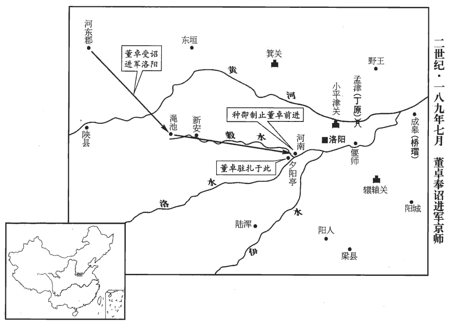 董卓聞召,即時就道,并上書曰:「中常侍張讓等,竊倖承寵,濁亂海內。臣聞揚湯止沸莫若去薪;去,羌呂翻。前書:枚乘諫吳王曰:欲湯之凔,一人炊之,百人揚之,無益也,不如絕薪止火而已。凔,音則亮翻,寒也。潰癰雖痛,勝於內食。言癰疽蘊結,破之雖痛,勝於內食肌肉,浸淫滋大也。昔趙鞅興晉陽‹太原›之甲以逐君側之惡,公羊傳曰:晉趙鞅取晉陽之甲以逐荀寅與士吉射者曷為?君側之惡人也。此逐君側之惡人,曷為以叛言之?無君命也。今臣輒鳴鐘鼓如雒陽,賢曰鳴鐘鼓者,聲其罪也。請收讓等以清姦穢!」太后猶不從。何苗謂進曰:「始共從南陽來,俱以貧賤依省內以致富貴,言何后因宦官得進,進兄弟以此致富貴也。國家之事,亦何容易。易,以豉翻。覆水不收,宜深思之,水覆於地,不可復收,言事發則不可收拾。且與省內和也。」卓至澠池,澠,彌兗翻。而進更狐疑,使諫議大夫种卲宣詔止之。卓不受詔,遂前至河南;河南,周之王城,去雒陽不遠。种,音沖。卲迎勞之,勞,力到翻。因譬令還軍。卓疑有變,使其軍士以兵脅卲。卲怒,稱詔叱之,軍士皆披,披,芳靡翻。遂前質責卓;卓辭屈,乃還軍夕陽亭。賢曰:夕陽亭在河南城西。卲,暠之孫也。