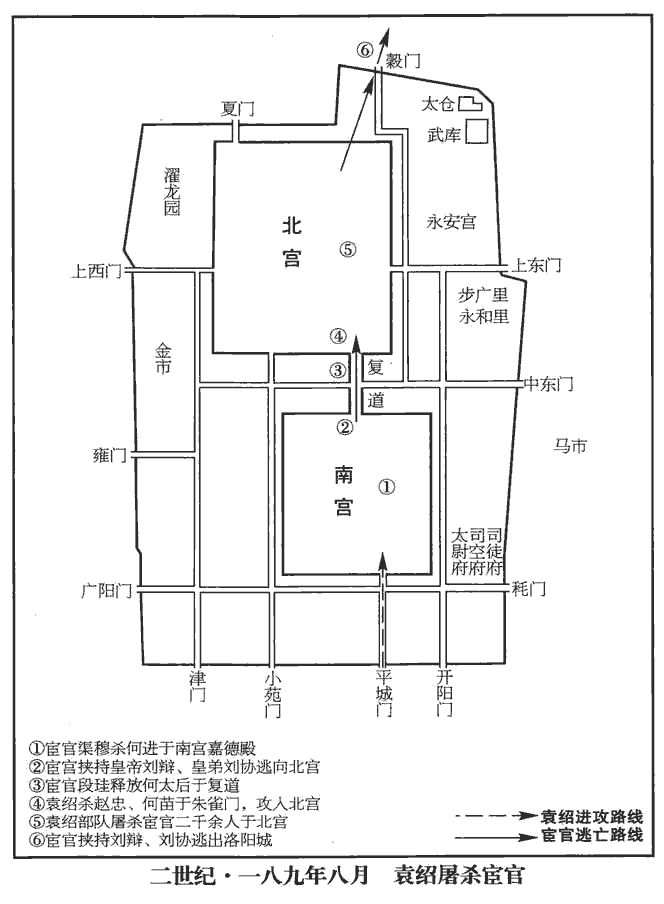 進部曲將吳匡、張璋在外,聞進被害,被,皮義翻。欲引兵入宮,宮門閉。虎賁中郎將袁術與匡共斫攻之,中黃門持兵守閤。會日暮,術因燒南宮青瑣門,衛瓘guàn曰:青瑣,門邊青鏤也。一曰天子門內有眉格再重,裹青畫曰瑣。考異曰:何進傳作「九龍門」。今從袁紀。欲以脅出讓等。讓等入白太后,言大將軍兵反,燒宮,攻尚書闥tà,尚書闥,即尚書門。因將太后、少帝及陳留王劫省內官屬,從複道走北宮。將,如字,攜也,挾也。尚書盧植執戈於閤道窗下,仰數段珪;數,所具翻。珪懼,乃釋太后,太后投閤,乃【章:甲十一行本「乃」作「得」;乙十一行本同;孔本同。】免。袁紹與叔父隗矯詔召樊陵、許相,斬之。紹及何苗引兵屯朱雀闕下,捕得趙忠等,斬之。吳匡等素怨苗不與進同心,而又疑其與宦官通謀,乃令軍中曰:「殺大將軍即【章:甲十一行本「卽」上有「者」字;乙十一行本同;孔本同;張校同。】車騎也,時苗為車騎將軍。吏士能為報讎乎!」為,于偽翻。皆流涕曰:「願致死!」匡遂引兵與董卓弟奉車都尉旻攻殺苗,棄其尸於苑中。紹遂閉北宮門,勒兵捕諸宦者,無少長皆殺之,少,詩照翻。長,知兩翻。凡二千餘人,或有無須而誤死者。須,古鬚字通。紹因進兵排宮,或上端門屋,以攻省內。宮之正南門曰端門,省禁也。