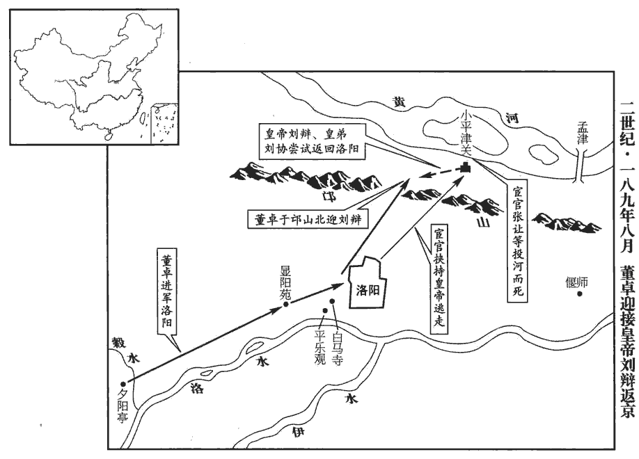 〖译文〗 闵贡扶着少帝与陈留王刘协,在夜里追着萤火虫的微光徒步向南走,想回到宫中。走了几里地,得到百姓家一辆板车,大家一齐上车,到达洛舍歇息。辛未(二十八日),找到马匹,少帝独自骑一匹,陈留王刘协和闵贡合骑一匹,从洛舍向南走,这时才逐渐有公卿赶来。董卓率军到显阳苑,远远望见起火,知道发生变故,便统军急速前进。天还没亮,来到城西,听说少帝在北边,就与大臣们一齐到北芒阪下奉迎少帝。少帝见董卓突然率大军前来,吓得哭泣。大臣们对董卓说:“皇帝下诏,要军队后撤。”董卓说:“你们这些人身为国家大臣,不能辅佐王室,致使皇帝在外流亡,为什么要军队后撤!”董卓上前参见少帝,少帝说起话来语无伦次。于是董卓又与陈留王刘协交谈问起事变经过,刘协一一回答,从始至终,毫无遗漏。董卓十分高兴,觉得刘协贤能,而且又是由董太后养大的,他认为自己与董太后同族,于是心里有了废黜少帝,改立刘协为皇帝的念头。