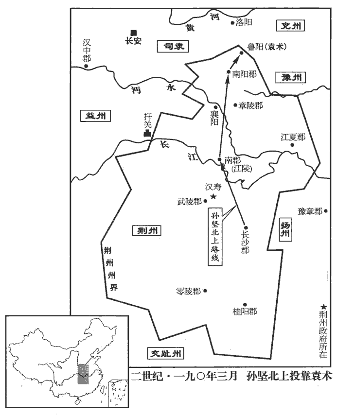 11初,荊州‹湖北湖南›刺史王叡裴松之曰:叡,晉太保祥伯父也。與長沙‹湖南長沙›太守孫堅共擊零‹湖南永州›、桂‹湖南郴州›賊,零、桂,零陵、桂陽也。以堅武官,言頗輕之。及州郡舉兵討董卓,叡與堅亦皆起兵。叡素與武陵‹湖南常德›太守曹寅不相能,揚言當先殺寅。寅懼,詐作按行使者檄移堅說叡罪過,令收,行刑訖,以狀上。上,時掌翻。堅承檄,即勒兵襲叡。叡聞兵至,登樓望之,遣問「欲何為?」堅前部答曰:「兵久戰勞苦,欲詣使君求資直耳。」據吳錄,資直者,衣資之直也。叡見堅驚曰:「兵自求賞,孫府君何以在其中?」堅曰:「被使者檄誅君!」被,皮義翻。叡曰:「我何罪?」堅曰:「坐無所知!」叡窮迫,刮金飲之而死。陶弘景曰:生金有毒,不鍊,服之殺人。堅前至南陽,眾已數萬人。南陽太守張咨不肯給軍糧,堅誘而斬之;陳壽志曰:堅以牛酒誘之。吳歷曰:堅詐疾以誘之。郡中震慄,無求不獲。前到魯陽‹河南鲁山›,魯陽縣屬南陽郡。與袁術合兵。術由是得據南陽,考異曰:范書術傳云:「劉表上術為南陽太守。」表傳云:「術阻兵屯魯陽,表不得至荊州。魏志術傳:「孫堅殺張咨,術得據南陽。」魏武帝紀,此年二月已云術屯南陽。蓋術初奔魯陽,此春孫堅取南陽,術乃據之,猶以魯陽為治所也。表堅行破虜將軍、領豫州刺史。