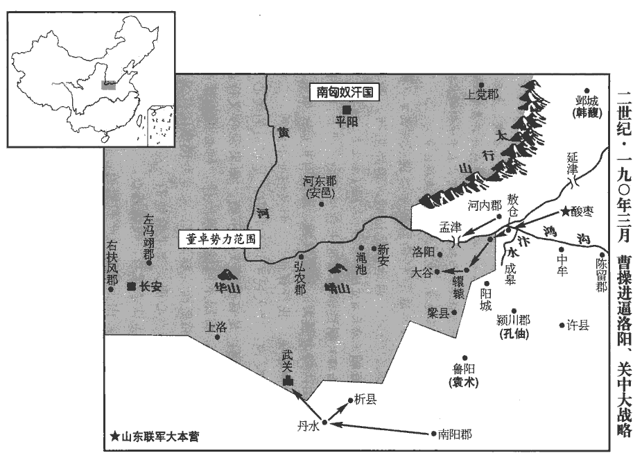 操到酸棗,諸軍十餘萬,日置酒高會,不圖進取,操責讓之,因為謀曰:為,于偽翻;下同。「諸君能聽吾計,使勃海引河內‹河南武陟›之眾臨孟津‹河南孟津东黄河渡口›,勃海,謂袁紹也。酸棗諸將守成皋,據敖倉‹河南荥阳北敖山粮仓›,塞轘轅‹河南登封西北›、太谷‹河南偃师西南›,全制其險,塞,悉則翻。轘,音環。使袁將軍率南陽之軍軍丹‹河南淅川›、析‹河南西峡›,入武關‹陕西商县西南›,此謂袁術也。丹水及析縣皆屬弘農郡。以震三輔,皆高壘深壁,勿與戰,益為疑兵,示天下形勢,以順誅逆,可立定也。觀操之計,但欲形格勢禁,待其變起於下耳,非主於戰也。今兵以義動,持疑不進,失天下望,竊為諸君恥之!」邈等不能用。操乃與司馬沛國‹安徽淮北›夏侯惇等詣揚州‹安徽中部及江南›,募兵,得千餘人,還屯河內。從袁紹也。