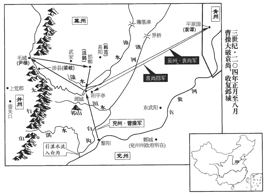 二月,袁尚復攻袁譚於平原‹山东平原›,復,扶又翻。留其將審配、蘇由守鄴‹河北临漳西南邺镇›。曹操進軍至洹huán水,水經:洹水出上黨泫氏縣,東過隆慮縣北,又東北出山,逕鄴縣南。洹,于元翻,又音桓。蘇由欲為內應,謀泄,出奔操。操進至鄴‹河北临漳西南邺镇›,為土山、地道以攻之。尚武安‹河北武安›長尹楷屯毛城‹河北涉县西北›,以通上黨‹山西长子›糧道。武安縣,屬魏郡,唐洺州地。長,知兩翻;下同。夏,四月,操留曹洪攻鄴,自將擊楷,破之而還;又擊尚將沮鵠hú於邯鄲,拔之。裴松之曰:沮,音葅。河朔間,今猶有此姓。鵠,沮授子也。沮,子余翻。邯鄲,音寒丹。