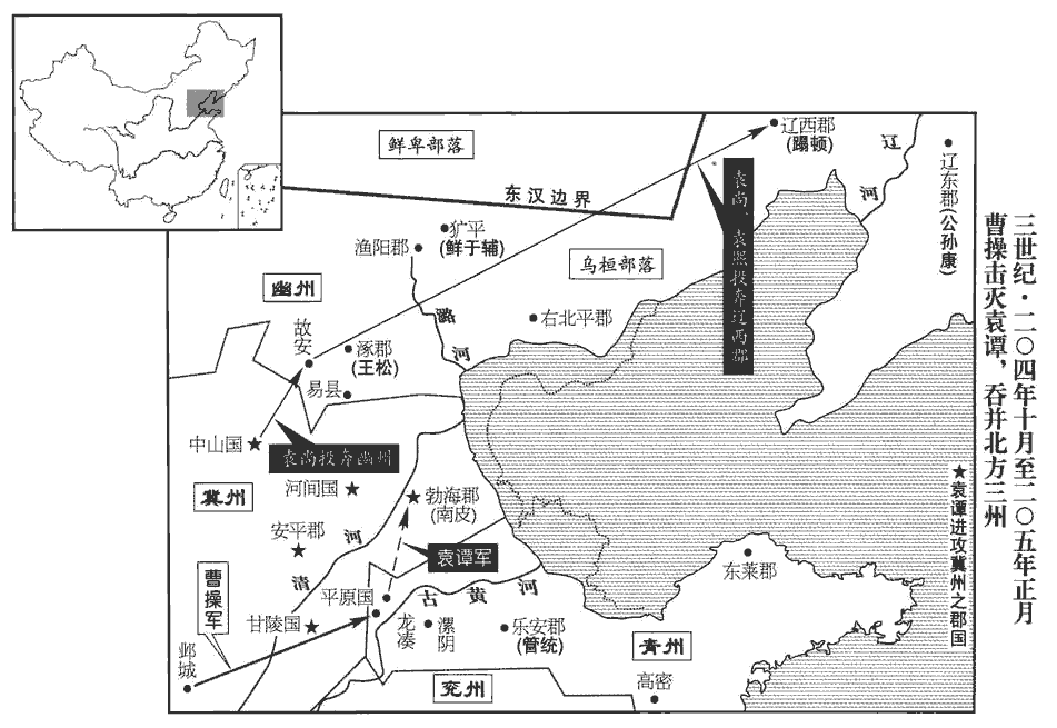 逄紀、審配素為譚所疾,逄páng,皮江翻。辛評、郭圖皆附於譚,而與配、紀有隙。及紹薨,眾以譚長,欲立之。配等恐譚立而評等為害,遂矯紹遺命,奉尚為嗣。譚至,不得立,自稱車騎將軍,袁紹初起兵,自稱車騎將軍,故譚亦稱之。屯黎陽‹河南浚县›。尚少與之兵,少,詩沼翻。而使逄紀隨之。譚求益兵,審配等又議不與。譚怒,殺逄紀。秋,九月,曹操渡河攻譚。譚告急於尚,尚留審配守鄴‹河北临漳西南邺镇›,自將助譚,與操相拒。連戰,譚、尚數敗,退而固守。數,所角翻。