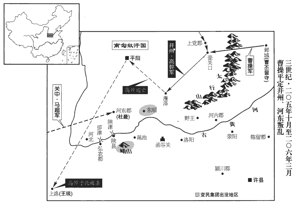 會白騎攻東垣‹山西垣曲›,白騎,張白騎之眾相聚為賊者也。垣縣,屬河東郡,「東」字衍。續漢志,垣縣,註云:山在東,狀如垣。蓋此時已有東垣之名。騎,奇寄翻。高幹入濩huò澤‹山西阳城西›。濩澤縣,屬河東郡。賢曰:今澤州縣。師古曰:濩,音烏號翻。畿知諸縣附己,乃出,單將數十騎,赴堅壁而守之,將,即亮翻。堅壁,壁壘之最堅者。吏民多舉城助畿者,舉城,謂舉屬縣城也。比數十日,比,必寐翻。得四千餘人。固等與高幹、張晟共攻畿,不下,略諸縣,無所得。曹操使議郎張既西徵關中諸將馬騰等,皆引兵會擊晟等,破之,斬固、琰等首,其餘黨與皆赦之。