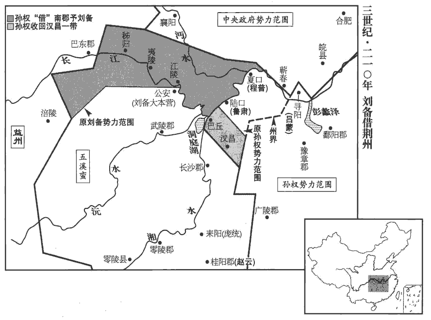 7周瑜攻曹仁歲餘,所殺傷甚眾,仁委城走。權以瑜領南郡太守,屯據江陵;守式又翻。程普領江夏太守,治沙羡‹湖北武昌西南金口镇›;夏,戶雅翻。羡,音夷。呂范領彭澤‹江西湖口东›太守;范傳云:范領彭澤太守,以彭澤、柴桑、歷陽為奉邑。呂蒙領尋陽令‹湖北武穴东北›。劉備表權行車騎將軍,領徐州牧。會劉琦卒,權以備領荊州牧,周瑜分南岸地‹湖北江陵对岸›以給備。荊江之南岸,則零陵、桂陽、武陵、長沙四郡地也。備立營於油口‹湖北公安›,改名公安。水經:南平郡孱陵縣有油水,西北注于江,曰油口。即劉備立營之處也。