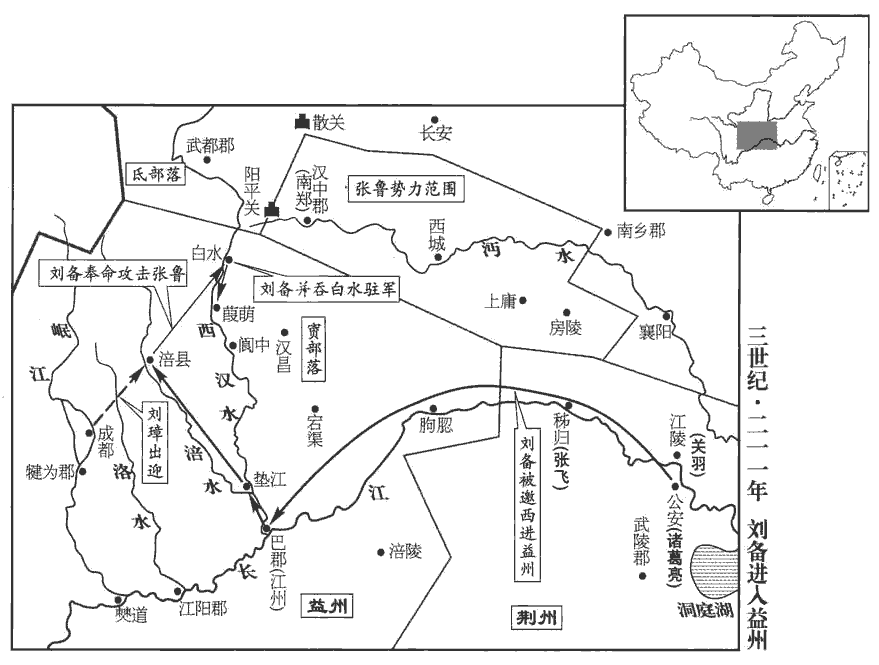 劉璋敕在所供奉備,備入境如歸,前後贈遺以巨億計。遺,于季翻。備至巴郡‹重庆›,巴郡太守嚴顏拊心歎曰:「此所謂『獨坐窮山,放虎自衛』者也。」備自江州北由墊江水詣涪‹四川绵阳›。巴郡,治江州。墊江縣‹重庆垫江›,屬巴郡。涪縣,屬廣漢郡。墊江水,蓋即涪內水也。庾yǔ仲雍曰:江州縣對二水口,右則涪內水,左則蜀外水。墊,音疊dié。涪,音浮。賢曰:涪縣故城,今綿州城。墊江縣,唐之合州。璋率步騎三萬餘人,車乘帳幔,乘,繩證翻。幔,莫半翻,幕也。精光耀日,往會之。張松令法正白備,便於會襲璋。備曰:「此事不可倉卒!」卒,讀曰猝。龐統曰:「今因會執之,則將軍無用兵之勞而坐定一州也。」備曰:「初入他國,恩信未著,此不可也。」璋推備行大司馬,領司隸校尉;備亦推璋行鎮西大將軍,領益州牧。晉百官志曰:四镇通於柔遠。謂鎮東、鎮西、鎮南、鎮北四將軍也。所將吏士,更相之適,之,往也。更,工衡翻。歡飲百餘日。璋增備兵,厚加資給,使擊張魯,又令督白水‹四川广元北朝天镇›軍。白水關,在廣漢白水縣,劉璋置軍屯守,即楊懷、高沛之軍也。杜佑曰:梁州金牛縣,漢葭萌縣地,縣南有故白水關。備并軍三萬餘人,車甲、器械、資貨甚盛。璋還成都,備北到葭萌‹四川广元西南›,葭萌縣,屬廣漢郡。賢曰:葭萌,今利州益昌縣。應劭曰:葭,音家。師古曰:萌,音氓。蜀王封其弟葭萌於此,因以名邑。先主改曰漢壽。未即討魯,厚樹恩德以收眾心。