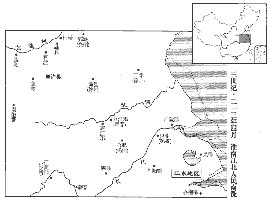 4初,曹操在譙‹安徽亳州›,恐濱江郡縣為孫權所略,欲徙令近內,近,其靳翻。以問揚州別駕蔣濟,曰:「昔孤與袁本初對軍官渡‹河南中牟东北›,徙燕‹河南延津›东北、白馬‹河南滑县›民,民不得走,賊亦不敢鈔。事見六十三卷建安五年。燕縣、白馬縣,皆屬東郡。燕,春秋之南燕國也。賢曰:燕故城今滑州胙zuò城縣。鈔,楚交翻。燕,於賢翻。今欲徙淮南民,何如?」對曰:「是時兵弱賊強,不徙必失之。自破袁紹以來,明公威震天下,民無他志,人情懷土,實不樂徙,樂,音洛。懼必不安。」操不從。既而民轉相驚,自廬江‹安徽寿县西南›、九江‹安徽寿县›、蘄qí春‹湖北蕲春›、廣陵‹江苏扬州›,戶十餘萬皆東渡江,蘄春縣,本屬江夏郡。沈約曰:吳立蘄春郡。此據吳志書之也。蘄,音祁。江西‹巢湖流域›遂虛,合淝以南,惟有皖城‹安徽潜山›。皖縣,屬廬江郡。賢曰:今舒州懷寧縣。師古曰:皖,音胡管翻。濟後奉使詣鄴‹河北临漳西南邺镇›,使,疏吏翻。操迎見,大笑曰:「本但欲使避賊,乃更驅盡之!」拜濟丹陽‹安徽宣城›太守。丹陽郡已屬孫權,濟不得之郡也。