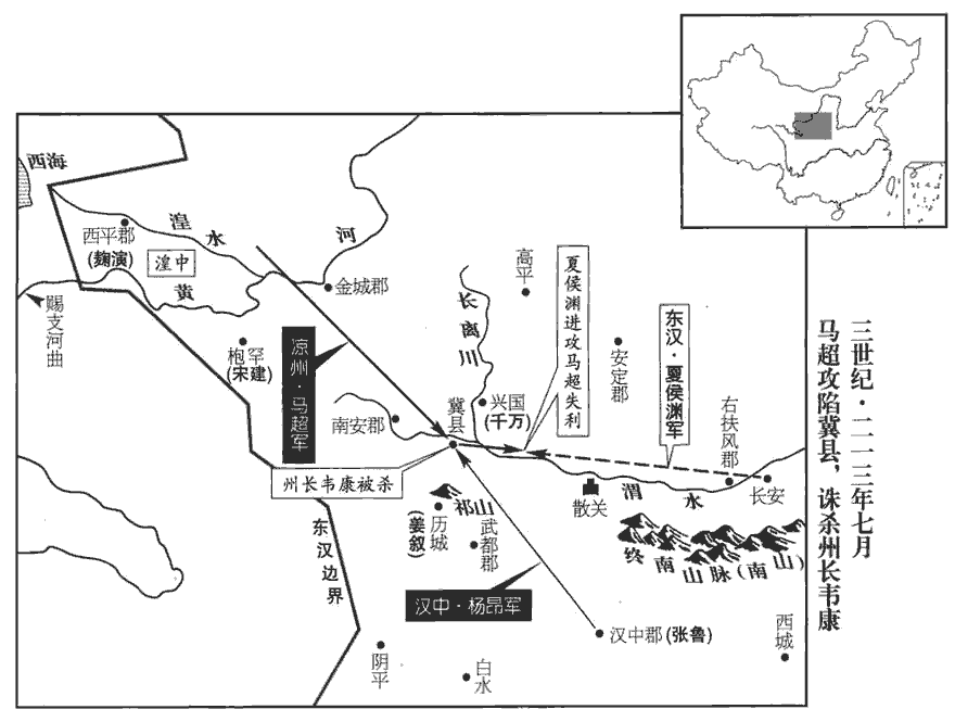 10初,魏公操追馬超至安定‹甘肃镇原东南曙光乡›,聞田銀、蘇伯反,引軍還。參涼州軍事楊阜言於操曰:「超有信、布之勇,甚得羌、胡心;若大軍還,不設備,隴上諸郡非國家之有也。」隴西、南安、漢陽、永陽,皆隴上諸郡也。獻帝起居注,初平四年,分漢陽、上郡為永陽。操還,超果率羌、胡擊隴上‹陇山之西›諸郡縣,郡縣皆應之,惟冀城‹甘肃甘谷›奉州郡以固守。冀縣,屬漢陽郡,郡及涼州刺史治焉。