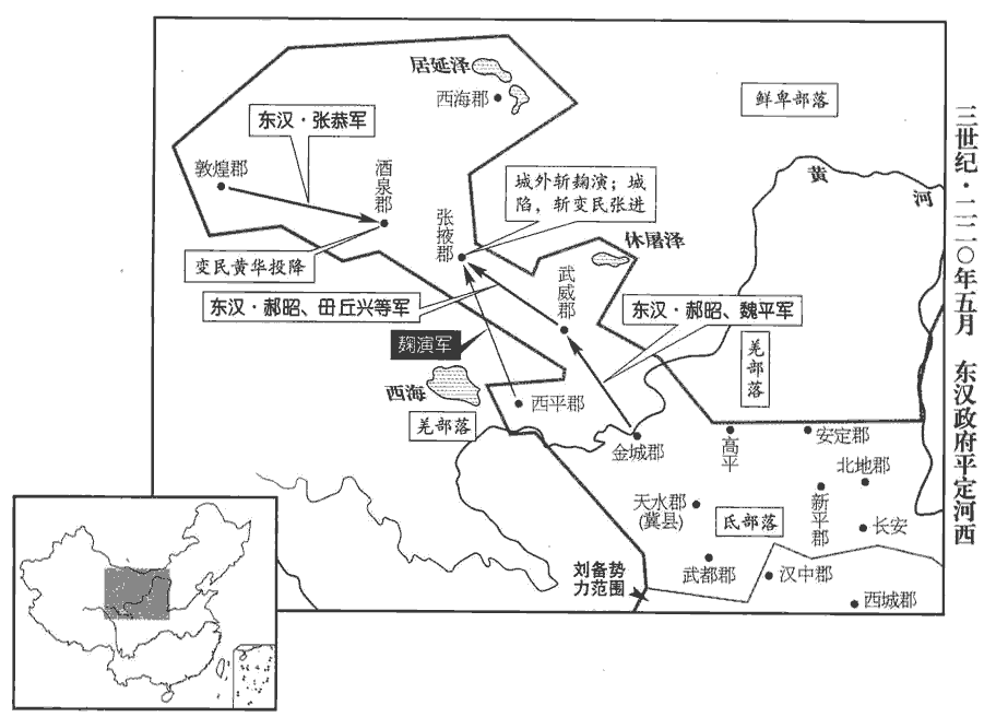 10王以安定‹甘肃镇原东南曙光乡›太守鄒岐為涼州刺史。西平‹青海西宁›麴qū演結旁郡作亂以拒岐;張掖張進執太守杜通,酒泉黃華不受太守辛機,皆自稱太守以應演;誅韓遂者麴演也;蓋威行涼部久矣,故進等皆應之。武威三種胡復叛。種,章勇翻。復,扶又翻。武威太守毌丘興毌guàn丘,複姓也。告急於金城‹甘肃兰州东›太守、護羌校尉扶風‹陕西兴平›蘇則,則將救之,郡人皆以為賊勢方盛,宜須大軍。時將軍郝昭、魏平先屯金城,受詔不得西渡。金城與武威、張掖、酒泉隔河。則乃見郡中大吏及昭等謀曰:「今賊雖盛,然皆新合,或有脅從,未必同心;因釁xìn擊之,善惡必離,離而歸我,我增而彼損矣。既獲益眾之實,且有倍氣之勢,率以進討,破之必矣。若待大軍,曠日彌久,善人無歸,必合於惡,善惡既合,勢難卒離。卒,讀曰猝。雖有詔命,違而合權,專之可也。」昭等從之,乃發兵救武威,降其三種胡,降,戶江翻;下同。與毌丘興擊張進於張掖。麴演聞之,將步騎三千迎則,辭來助軍,實欲為變,則誘而斬之,誘,音酉。出以徇軍,其黨皆散走。則遂與諸軍圍張掖,破之,斬進;黃華懼,乞降。據裴松之註,華即後為兗州刺史奏王淩者也。事見七十五卷邵陵厲公嘉平三年。河西平。