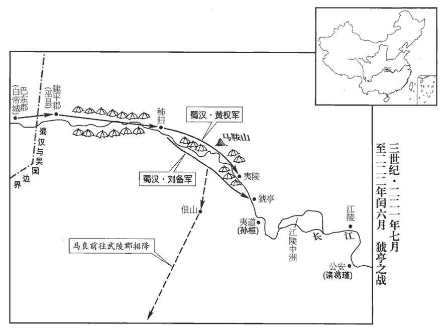 5漢主‹刘备,时年六十二›自秭歸‹湖北秭归›將進擊吳‹府武昌,湖北鄂州›,治中從事黃權諫曰:「吳人悍戰,而水軍㳂yán流,進易退難。捍,下罕翻,下旰翻。易,以豉翻。臣請為先驅以當寇,陛下宜為後鎮。」漢主不從,以權為鎮北將軍,使督江北諸軍;為漢主兵敗、權不能自反張本。自率諸將,自江南緣山截領,領,古嶺字通。軍於夷道‹湖北枝城›猇xiāo亭‹湖北枝江县西猇亭镇,北临长江›。裴松之曰:猇,許交翻。夷道縣漢屬南郡,吳屬宜都郡。吳將皆欲迎擊之。將,即亮翻。陸遜曰:「備舉軍東下,銳氣始盛;且乘高守險,難可卒攻。卒,讀曰猝。攻之縱下,猶難盡克,若有不利,損我大勢,非小故也。今但且獎厲將士,廣施方略,以觀其變。若此間是平原曠野,當恐有顛沛交逐之憂;今緣山行軍,勢不得展,自當罷於木石之間,徐制其敝耳。」罷,讀曰疲。魏人言陸議見兵勢,正由此耳。諸將不解,解,古買翻,曉也。以為遜畏之,各懷憤恨。