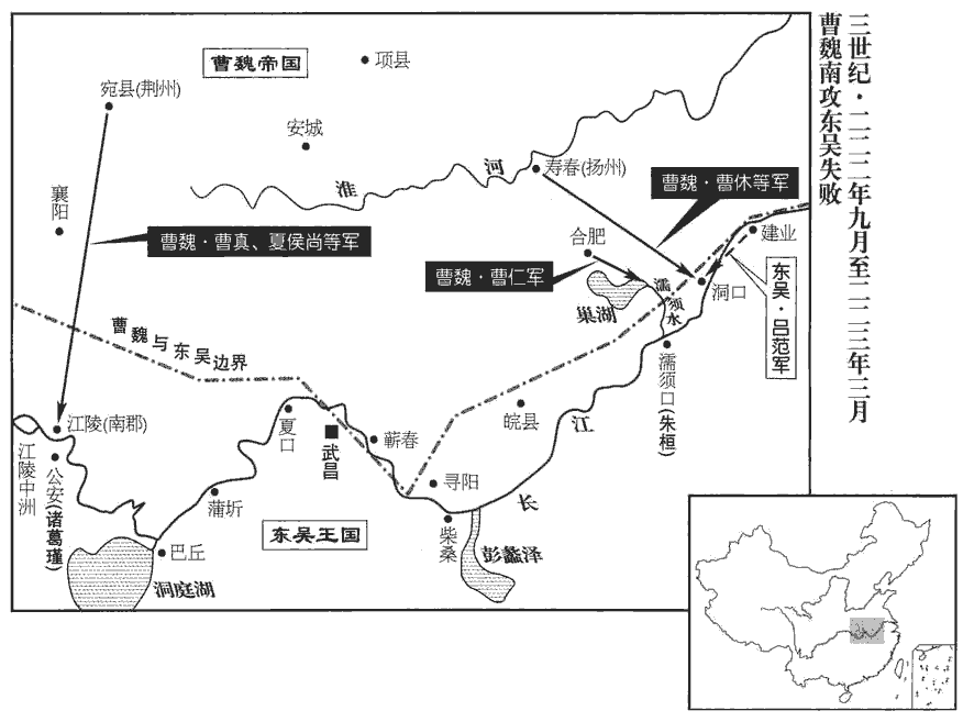 九月,命征東大將軍曹休、前將軍張遼、鎮東將軍臧霸出洞口‹安徽和县南长江渡口›,據張遼傳,帝遣遼與曹休至海陵,臨江與諸將破呂范。又據賀齊傳,齊督扶州以上至皖。黃武初,魏使曹休來伐,齊住新市,會洞口諸軍遭風流溺,賴齊未濟,諸將倚以為勢,休等憚之,遂引軍還。又據王淩傳,遼等至廣陵臨江。蓋廣陵即海陵也。蕭子顯曰:南兗州刺史每以秋月出海陵觀濤;與京口對岸。又據晉書譙王尚之傳,桓玄攻尚之于歷陽,使馮該斷洞浦,焚舟艦。則洞口在歷陽江邊明矣。大將軍曹仁出濡須‹安徽含山西南›,上軍大將軍曹真、征南大將軍夏侯尚、左將軍張郃、右將軍徐晃圍南郡‹湖北江陵›。郃,古合翻。吳建威將軍呂范督五軍,以舟軍拒休等,左將軍諸葛瑾‹时驻湖北公安›、平北將軍潘璋、將軍楊粲救南郡‹湖北江陵›,裨將軍朱桓以濡須督拒曹仁。