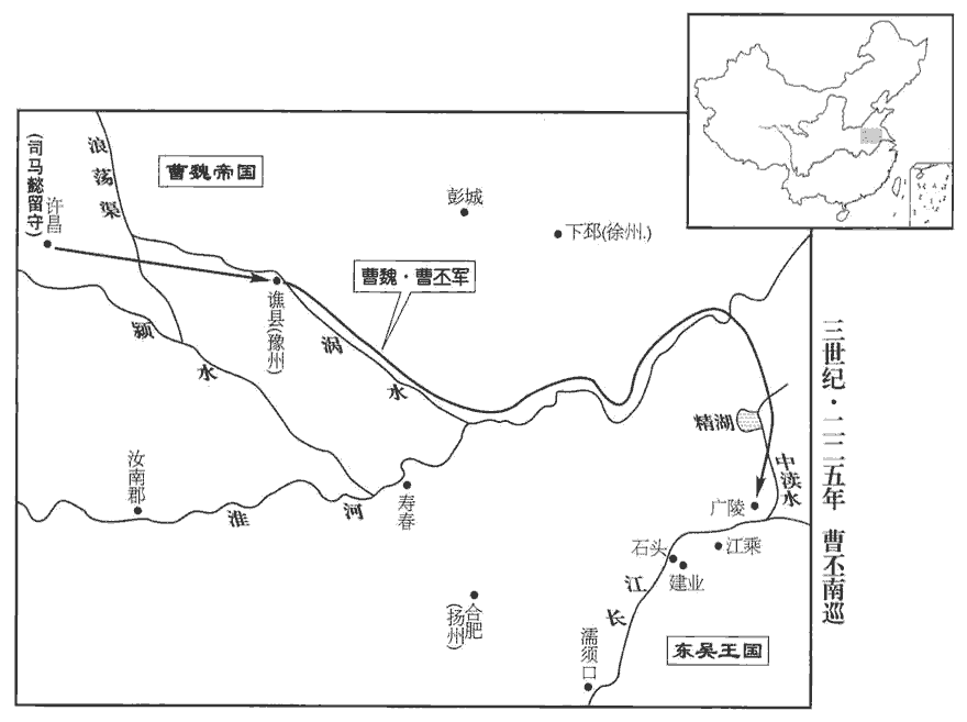 9八月,帝以舟師自譙循渦入淮。水經:陰溝水,出河南陽武縣蒗𦿆渠,東南至沛為渦水,渦水東逕譙郡,又東南至下邳淮陰縣入于淮。杜佑曰:亳州治譙縣,有渦水,渦guō音戈。尚書蔣濟表言水道難通,帝不從。冬,十月,如廣陵故城‹扬州›,廣陵故城謂之蕪城,今其處不可考。臨江觀兵,戎卒十餘萬,旌旗數百里,有渡江之志。吳人嚴兵固守。時天寒,冰,舟不得入江。帝見波濤洶湧,洶,許拱翻。歎曰:「嗟乎,固天所以限南北也!」遂歸。孫韶遣將高壽等率敢死之士五百人,於逕路夜要帝,要,一遙翻。帝大驚。壽等獲副車、羽蓋以還。還,從宣翻,又如字;下同。於是戰船數千皆滯不得行,議者欲就留兵屯田,蔣濟以為:「東近湖‹江苏高邮高邮湖›,北臨淮‹淮河›,若水盛時,賊易為寇,不可安屯。」近,其靳翻。易,以豉翻。帝從之,車駕即發。還,到精湖‹江苏高邮北›,據蔣濟傳,精湖在山陽;山陽在下邳淮陰縣界,今楚州山陽縣。水稍盡,盡留船付濟。船連延在數百里中,濟更鑿地作四五道,蹴cù船令聚;豫作土豚目錄作「土塍chéng」;廣韻作「土坉tún」,註云:以草裹土築城及鎮水也。遏è斷湖水,斷,丁管翻。皆引後船,一時開遏入淮中,乃得還。