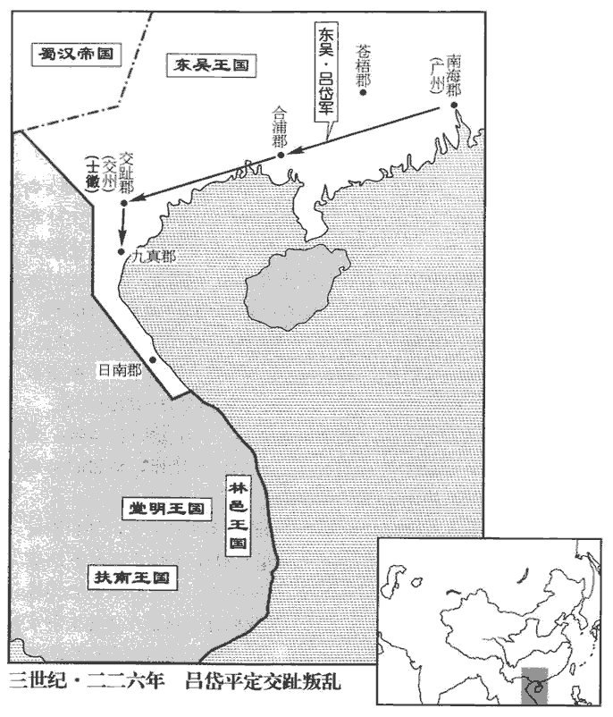 18徽大將甘醴及栢治率吏民共攻岱,岱奮擊,破之。於是除廣州,復為交州如故。岱進討九真‹越南清化›,斬獲以萬數;又遣從事南宣威命,暨徼外扶南‹柬埔寨›、林邑‹越南中部›、堂明‹老挝南部›諸王,各遣使入貢於吳。扶南在海大灣中,北距日南七千里。林邑國本漢象林縣地,直交趾海行三千里。堂明即道明國,在真臘北。徼jiào,吉弔翻。