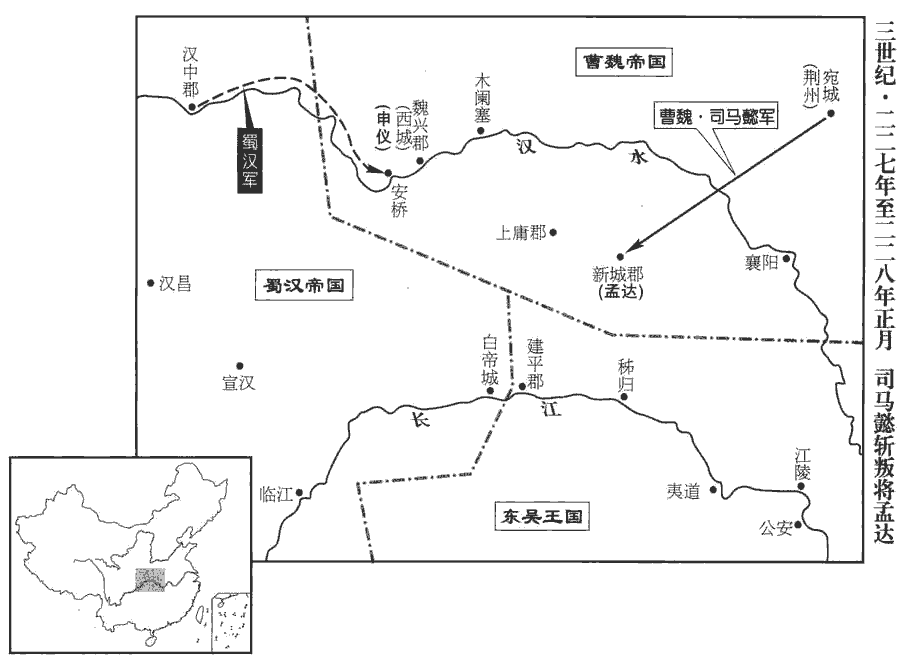 10初,孟達既為文帝所寵,又與桓階、夏侯尚親善;及文帝殂,階、尚皆卒,卒,子恤翻。達心不自安。諸葛亮聞而誘之,誘,音酉。達數與通書,陰許歸蜀;數,所角翻。達與魏興‹陕西安康›太守申儀有隙,魏興,蜀之西城郡也,文帝改曰魏興。儀密表告之。達聞之,惶懼,欲舉兵叛;司馬懿以書慰解之,達猶豫未決,懿乃潛軍進討。諸將言:「達與吳、漢交通,宜觀望而後動。」懿曰:「達無信義,此其相疑之時也。當及其未定促決之。」乃倍道兼行,八日到其城下‹新城郡,湖北房县›。吳、漢各遣偏將向西城安橋‹陕西安康西南›、木闌塞‹陕西旬阳东北›以救達,水經註:魏興安陽縣西北,有高橋溪口,文水入漢之口也。漢水又東逕西城縣故城南,又東逕木蘭塞南,右岸有城,名陵城,周回數里;左岸壘石數十行,重壘數十里,中謂之木蘭塞,盖吴兵向安橋而蜀兵向木蘭塞也,晏类要云:伎陵城在金州洵阳县,庾雍汉水记:即木蘭塞,蜀軍救孟達之所。懿分諸將以距之。初,達與亮書曰:「宛‹河南南阳›去洛‹洛阳东白马寺东›八百里,司馬懿時屯宛。去吾一千二百里。聞吾舉事,當表上天子,比相反覆,一月間也,上,时掌翻,比,必寐翻。則吾城已固,諸軍足辦。吾所在深險,司馬公必不自來;諸將來,吾無患矣。」及兵到,達又告亮曰:「吾舉事八日而兵至城下,何其神速也!」